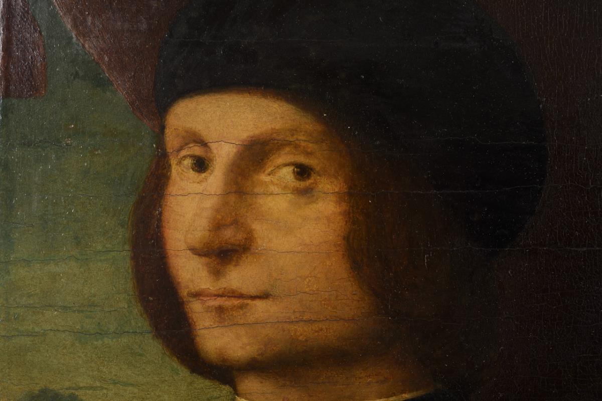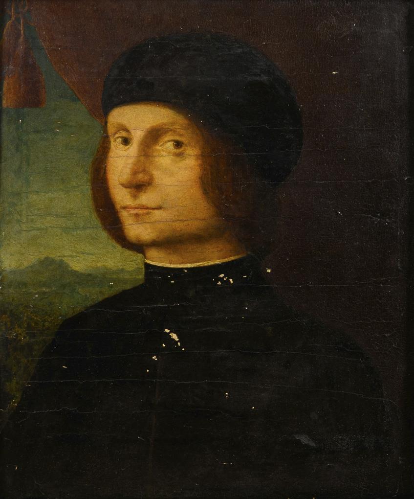 Portrait of a young man in black clothes with black headdress in front of an aired curtain, which gives a view of a mountainous landscape. Altrestored, traces of age.