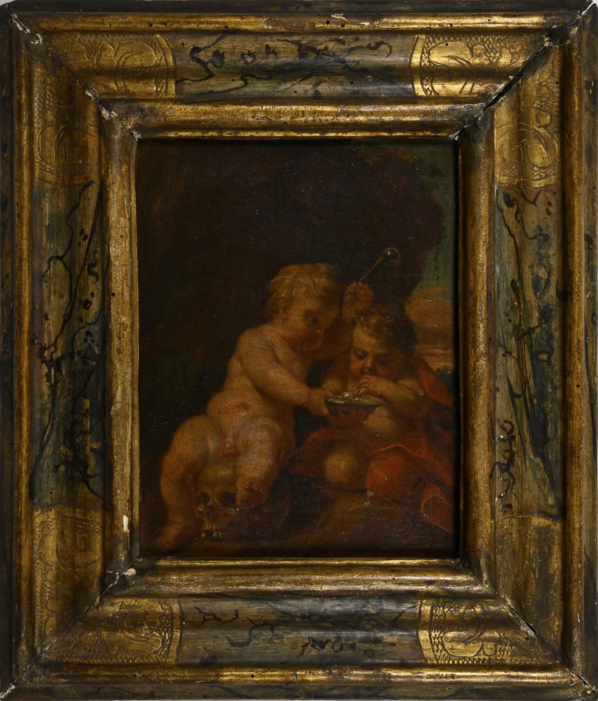 The two children on a rock with skull playing with the soap solution in the sunshine. Traces of age.