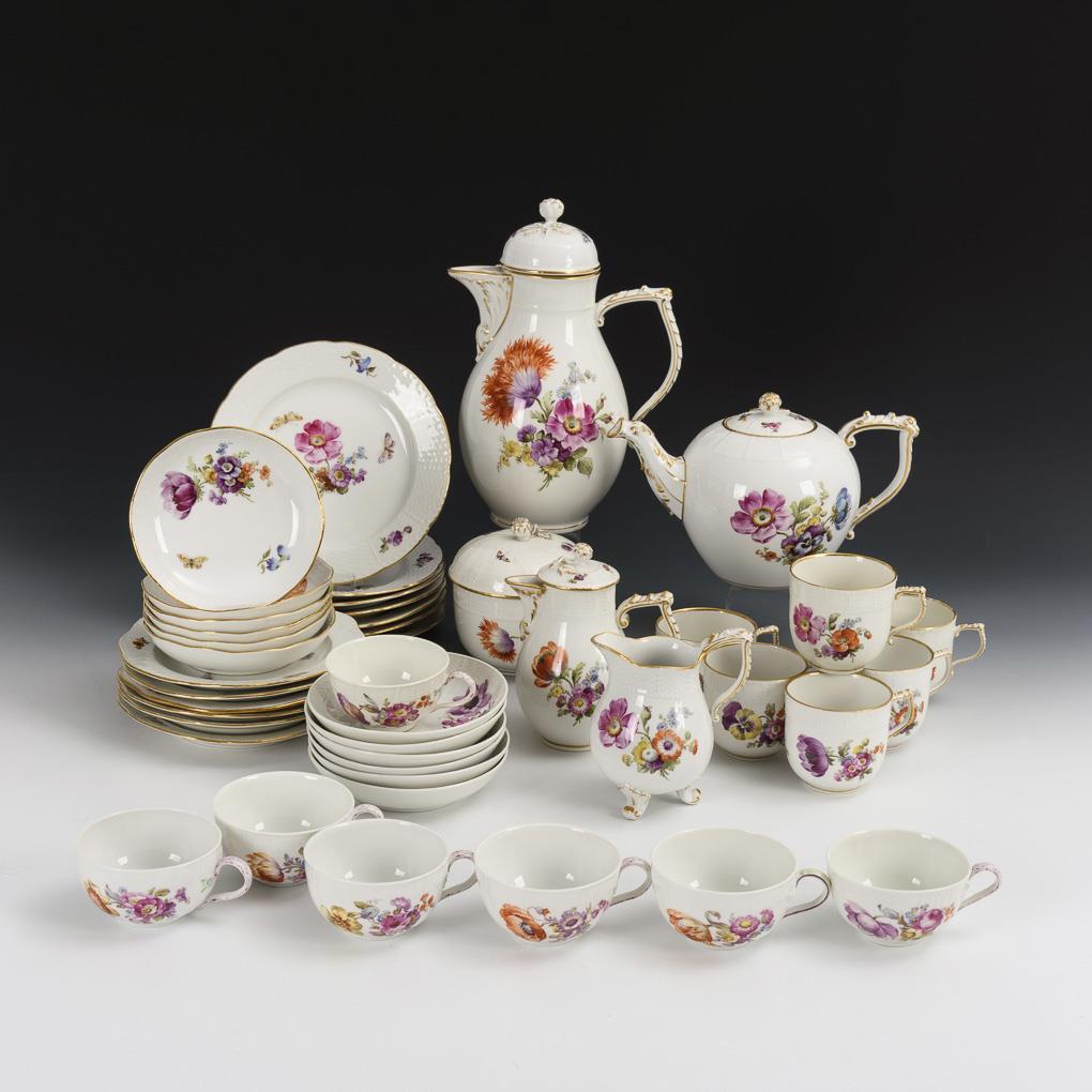 43 + 1 parts. Model "Altozier" and "Neuozier". Coffee pot (h 26,5 cm), tea pot, sugar bowl, 2 different milk jugs, 6 coffee cups with 6 saucers, 7 tea cups with 6 saucers, 7 breakfast plates and 6 cake plates. Plus 1 single lid. Chip on the rim of the teapot, hairline crack on the snipe of the teapot, bump on the knob and stand ring of the coffeepot, burn crack in the snipe of the coffeepot, chip on 1 teacup rim, partial minimal gold wear.