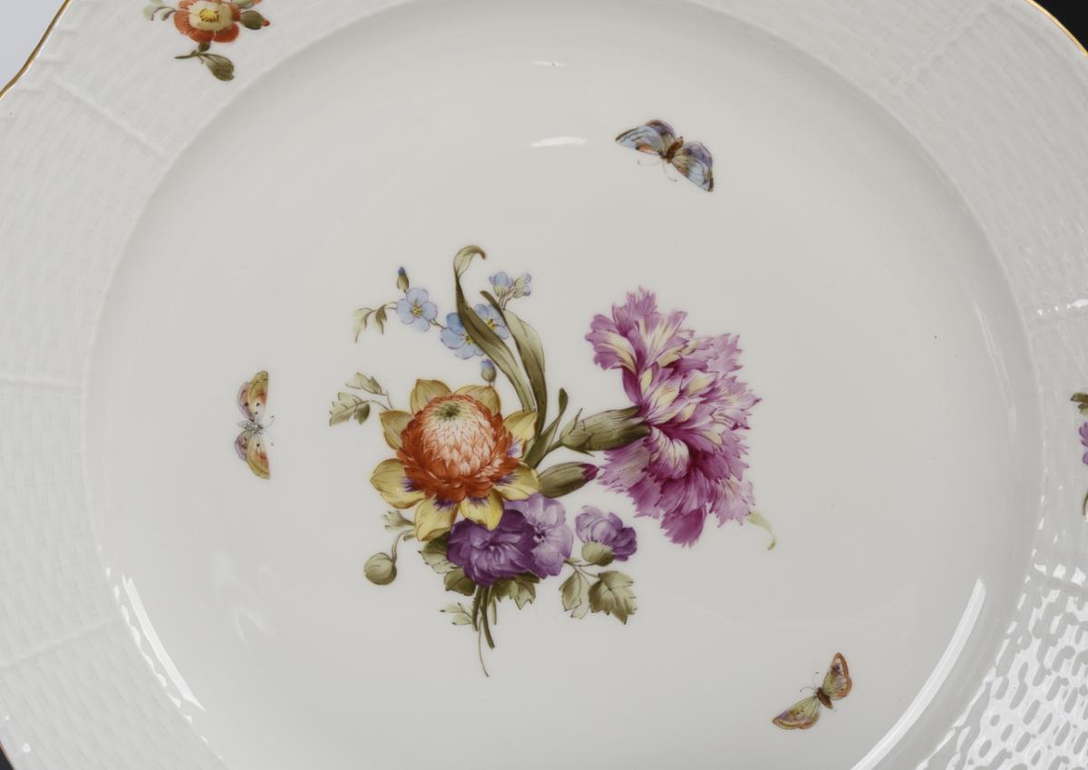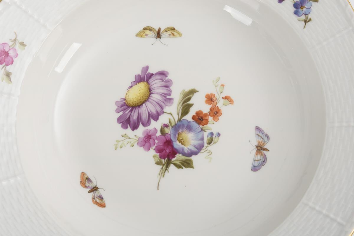 42 pieces. Model "Altozier". 23 dinner plates, 12 soup plates, 2 oval plates (L 31,5 and 40 cm), 2 vegetable plates (Ø 30,5 and 35 cm), 2 square bowls (21,5 x 20,5 and 22 x 23 cm) and 1 sauce boat. Bump on 1 dinner plate rim, partial minimal gold wear.