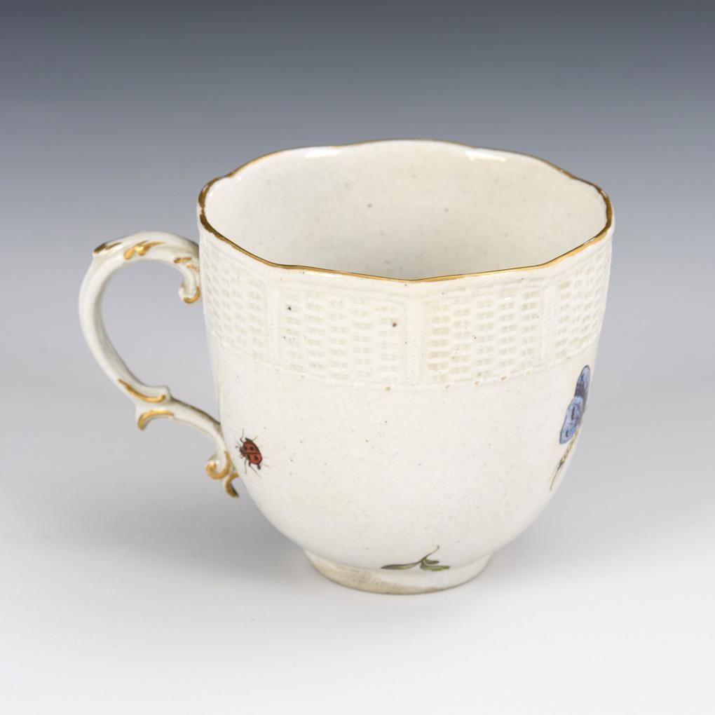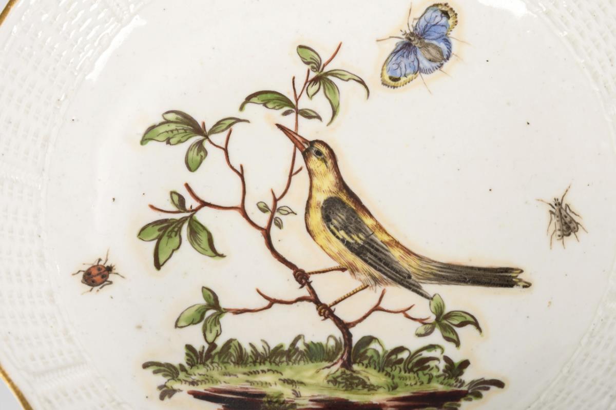 With the relief decoration "Altozier", cup with rocaille fief. On the front of the cup as well as in the mirror of the saucer bird and butterfly painting. Bump on the stand ring of the cup, on the underside of the saucer a small, burst air bubble.