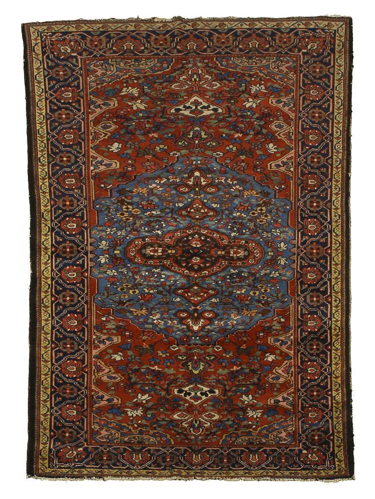 Wool, hand-knotted. Polychrome natural color decoration with predominantly red, blue, brown, yellow and pink. Approx 225 x 151 cm.