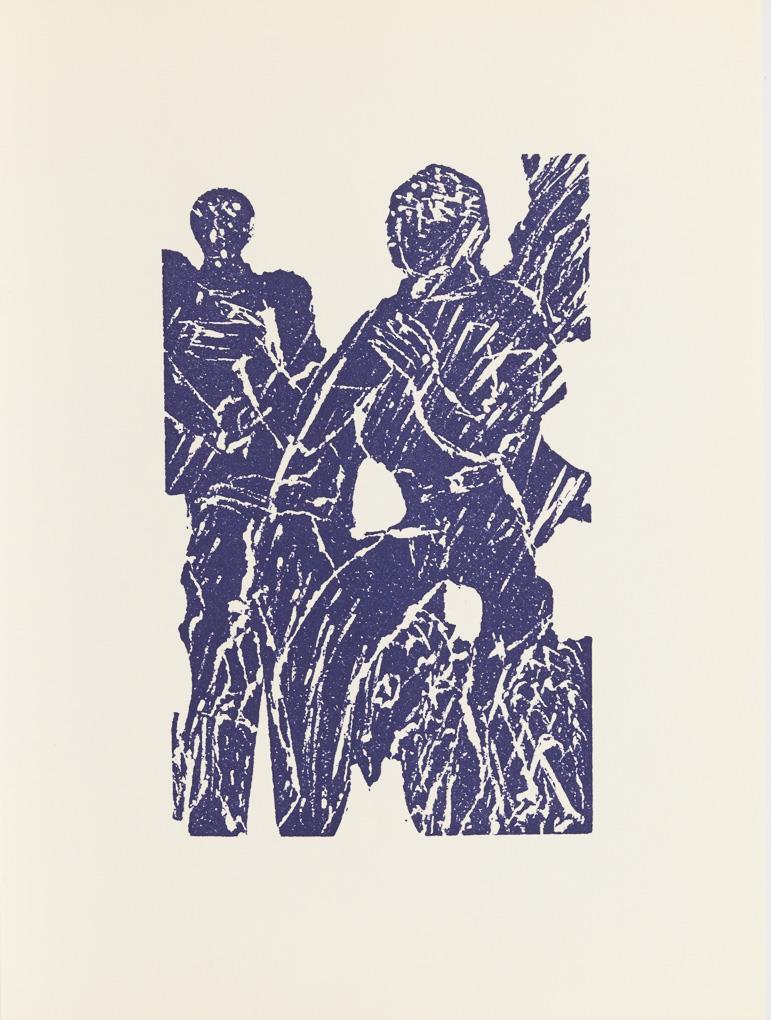 Original folding folder with 8 single-sheet prints (4 woodcuts and 4 offset prints) and accompanying booklet with imprint; plus insert with information on the original woodcuts; on the occasion of the exhibition of the Heidelberger Kunstverein, 1972. As an addition booklet "HAP Grieshaber's Garden of Health". Accompanying booklet somewhat foxed, folder somewhat stained.