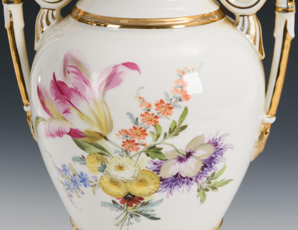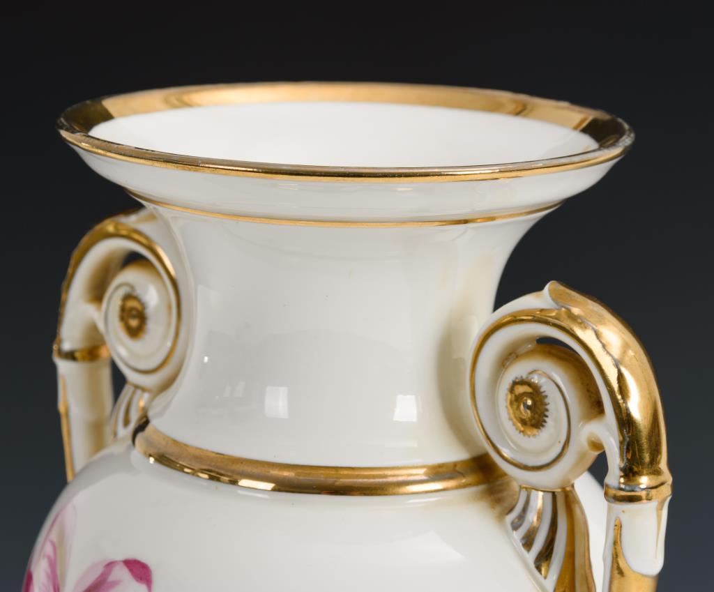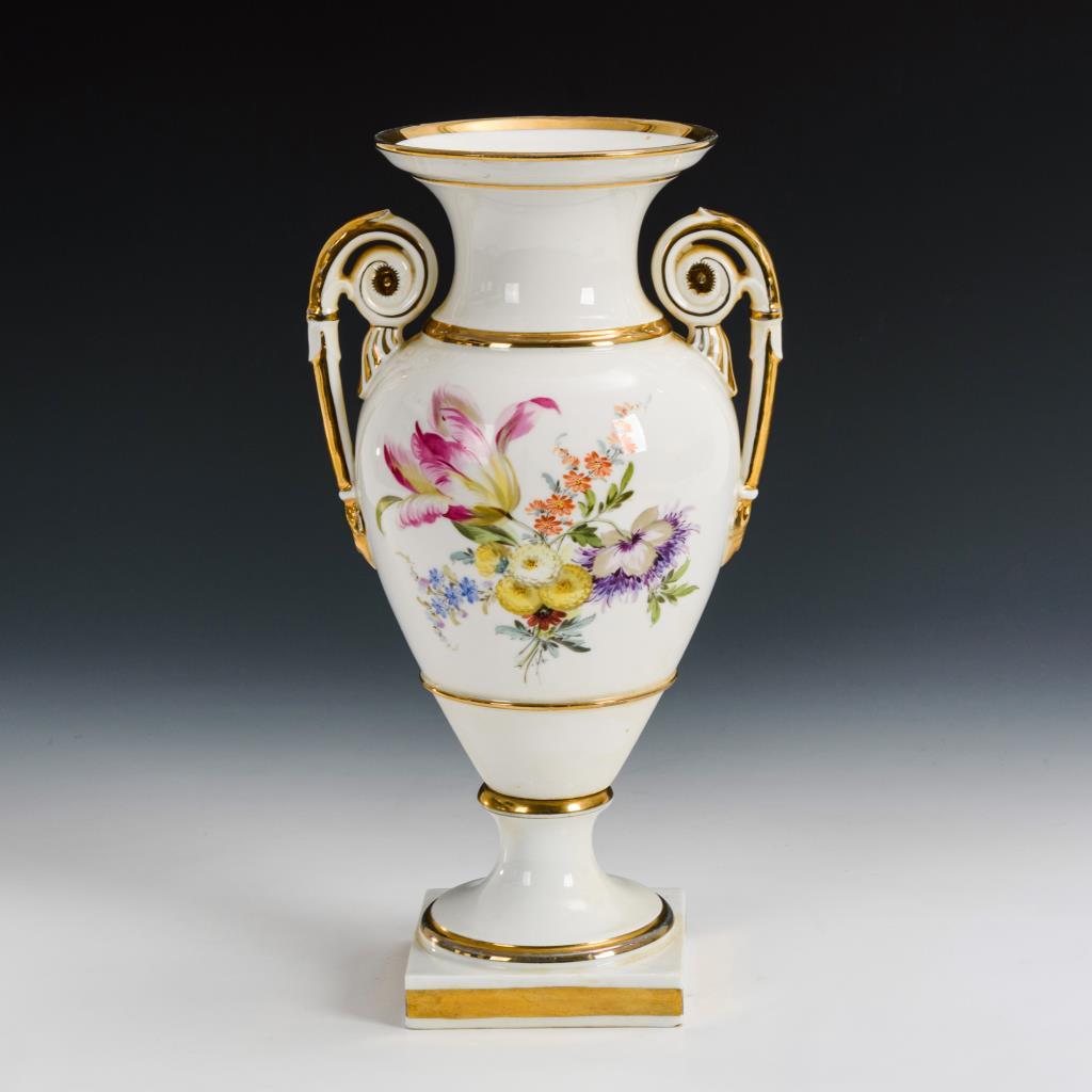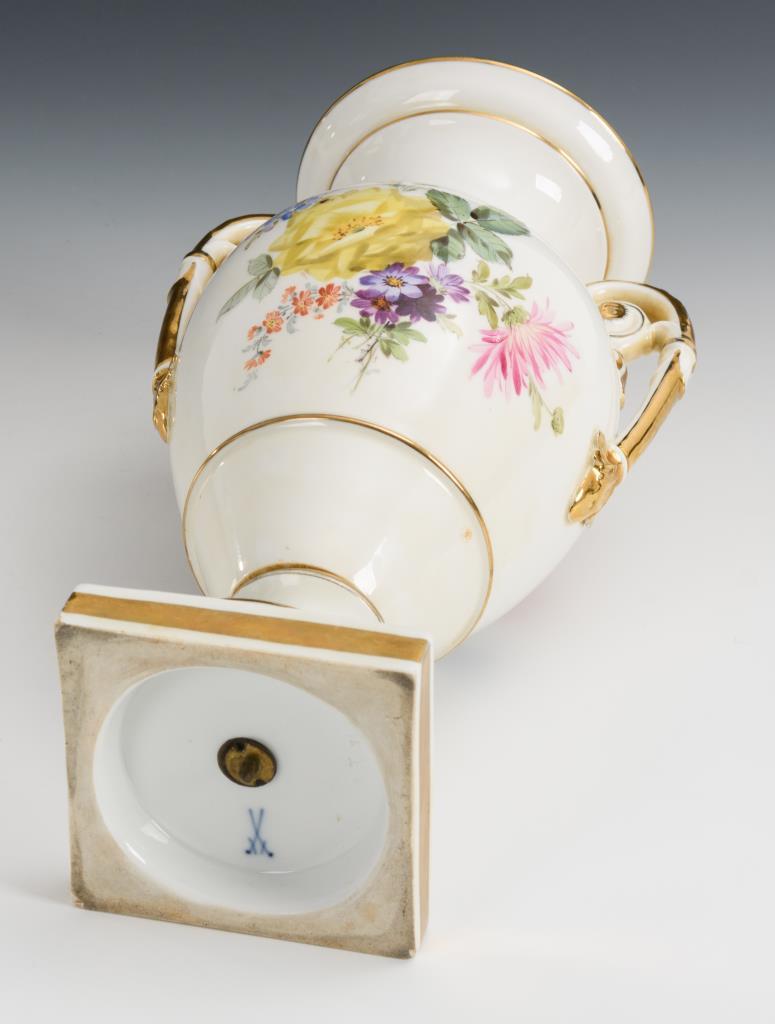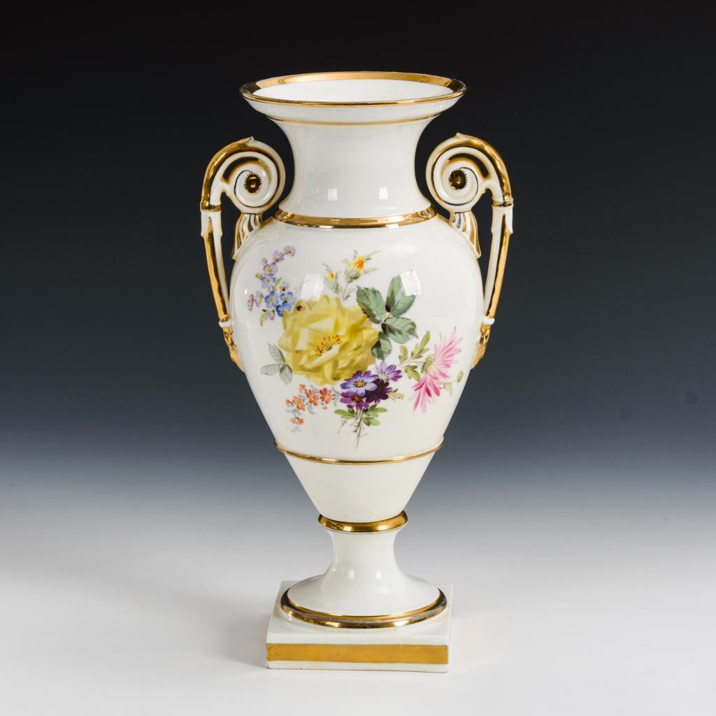 Ovoide Form mit zwei Rosettenhenkeln, Rundfuß, Quadratplinthe. Beidseitig ein Blumenbukett. Partieller Goldabrieb.