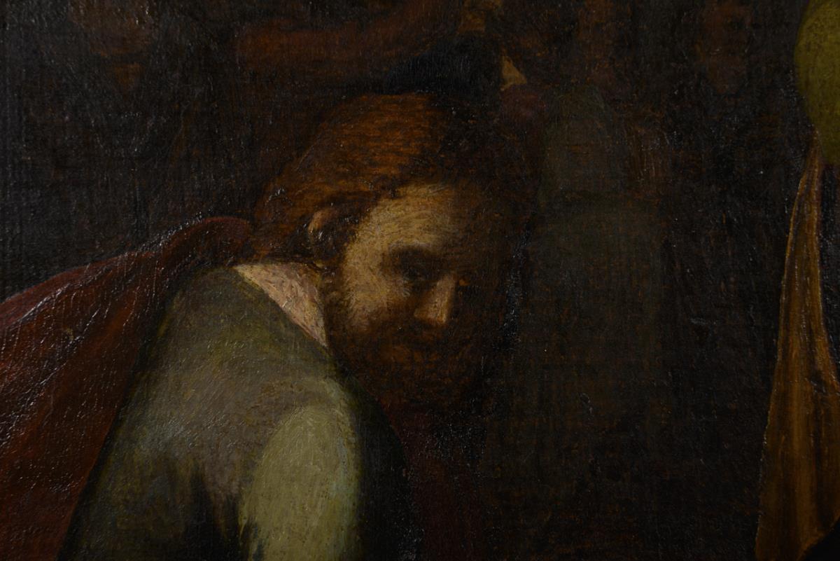 The kneeling Christ surrounded by many people and the adulteress approaching him with lowered eyes. Retouched, worn corners.