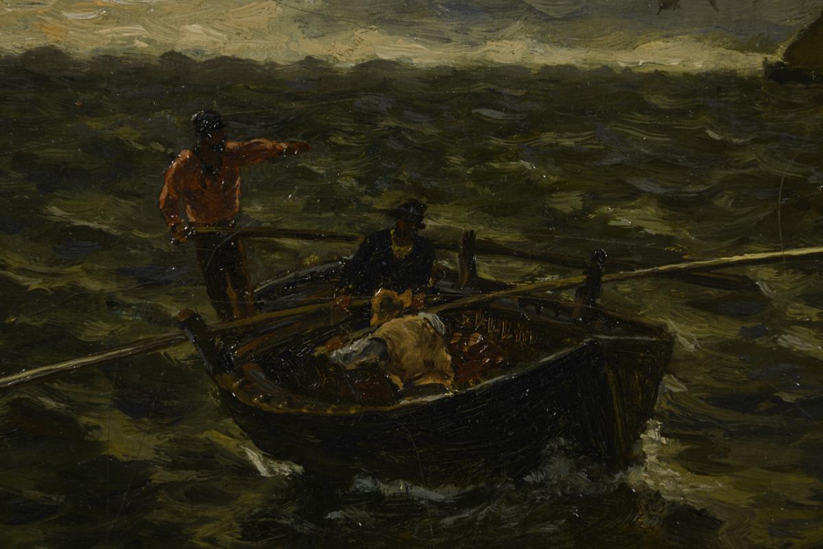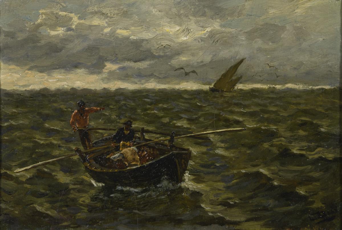 Oarsman in a boat near a sailor on the open sea under cloudy sky. Slight signs of age.