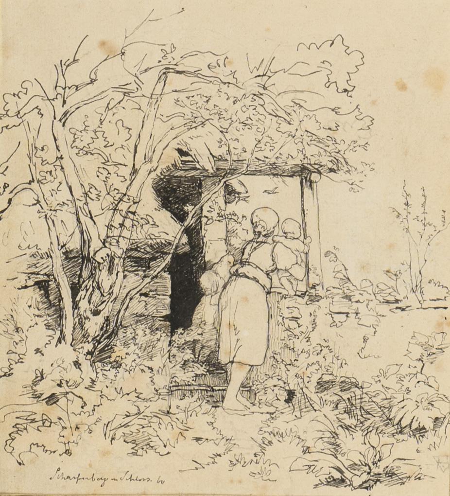 Romantic genre scene with young woman, 2 children and cat in the garden of the ruinous Scharfenberg Castle. Slightly foxed.