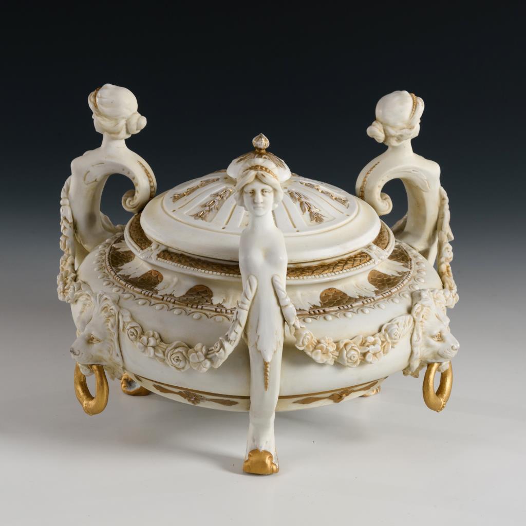 Gedrückt gebauchte Form, drei Hermenhenkel, drei Füße, Löwenmaskarone mit Ring sowie Blütengirlande auf der Wandung, Knaufdeckel. Partieller Goldabrieb, Restaurierungen.