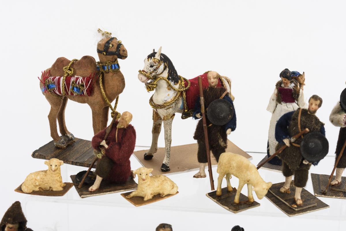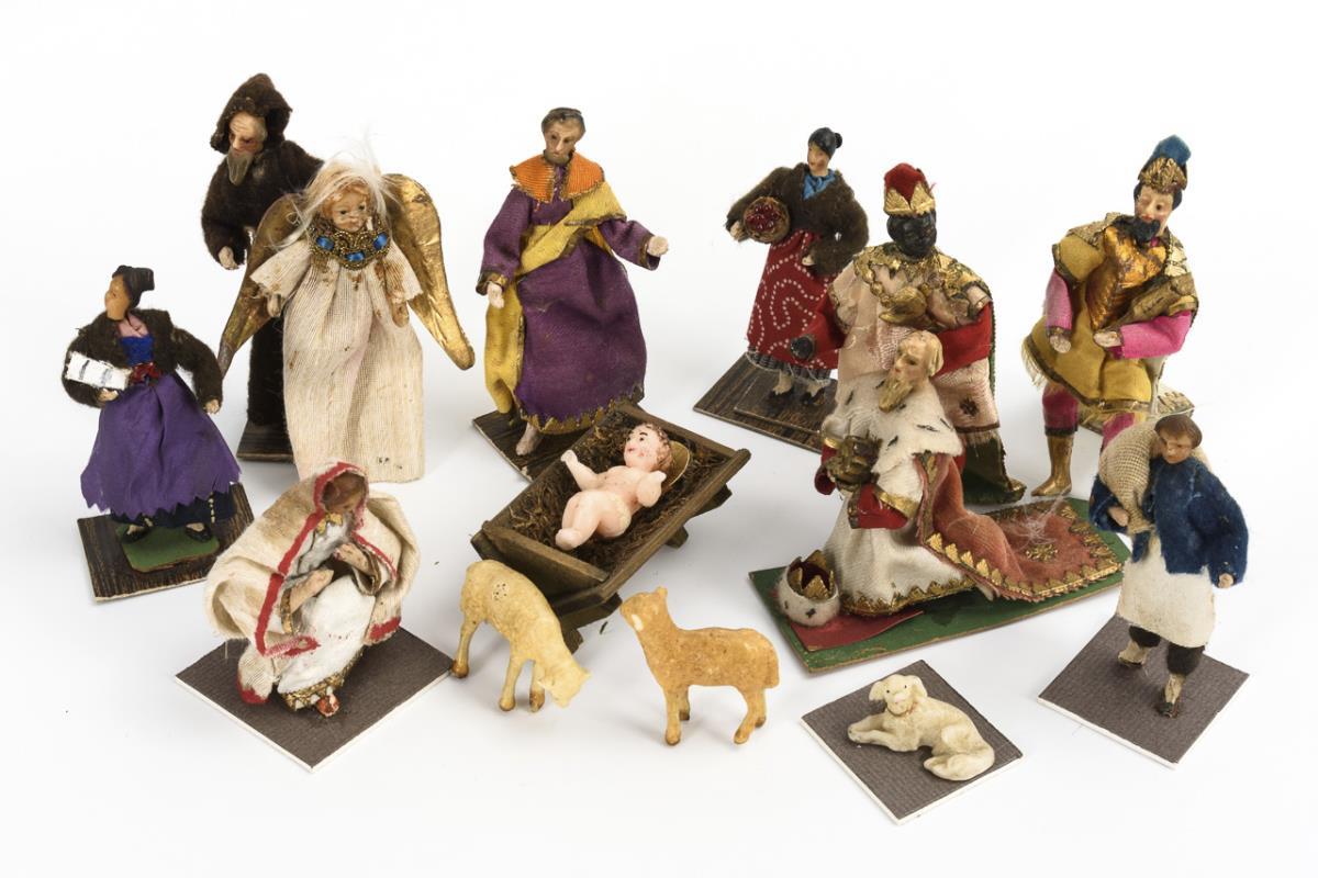 Approx. 24 small figures, including kings, Mary, Joseph, Christ child in manger, shepherds, sheep, etc. Fixed on younger supplemented cardboard. Partly with defects.