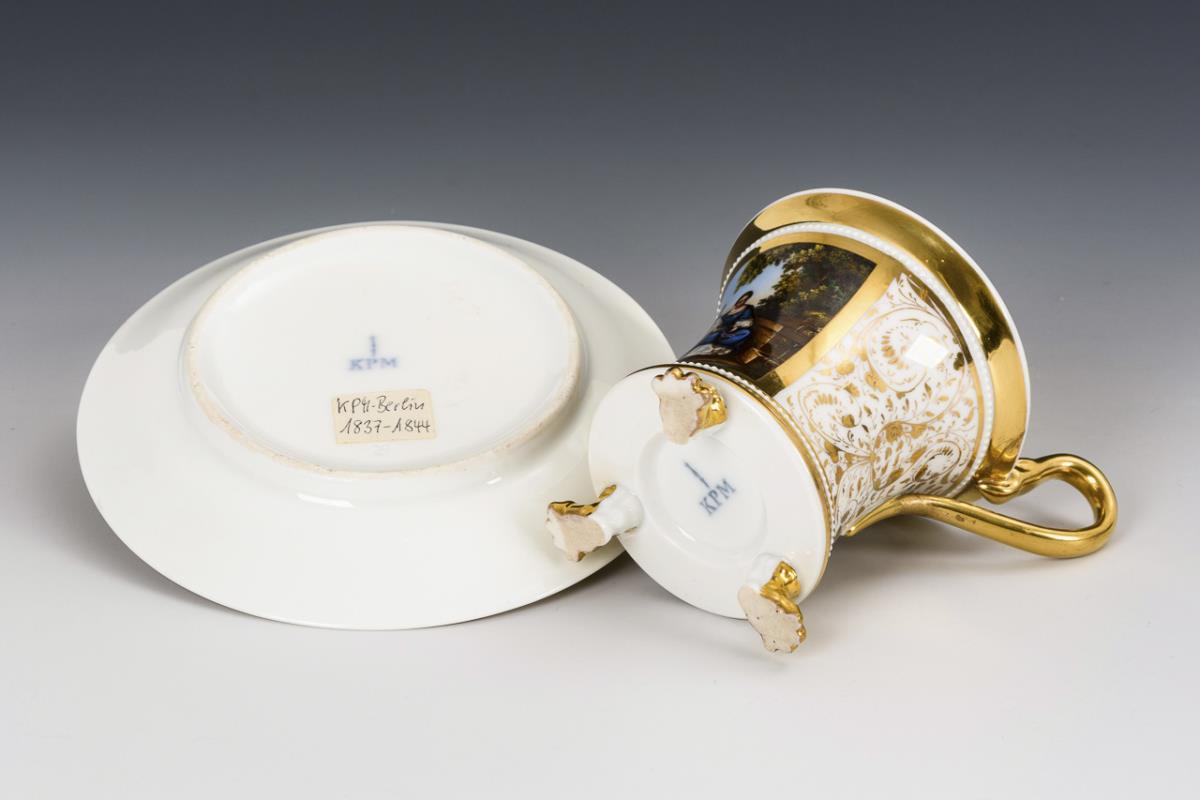 Craters cup with pearl bands, swan head handle and three paw feet. On the front a rectangular cartouche depicting two young Biedermeier ladies in a landscape, verso vegetal gold painting, in the mirror of the saucer the dedication "Dem golden Jubelpaar den 28ten Juny 1843.". Handle glued, partial minimal gold abrasion.