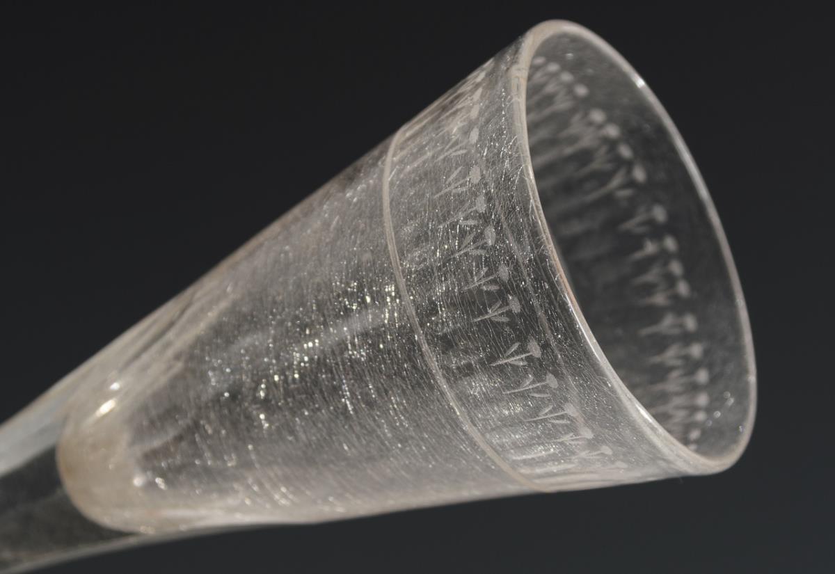 Faceted dome at base merging into solid faceted stem, round foot, dislocated breakaway. On the dome, an engraved border of pin flowers. Both glass-ranked.