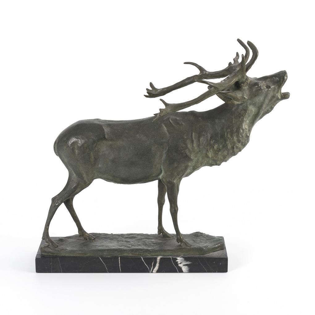 Régule bronze greenish patina, black marble plinth. Inscribed, foundry mark "Kraas Bildguss". H 40 cm, total 43 x 46 x 19 cm.