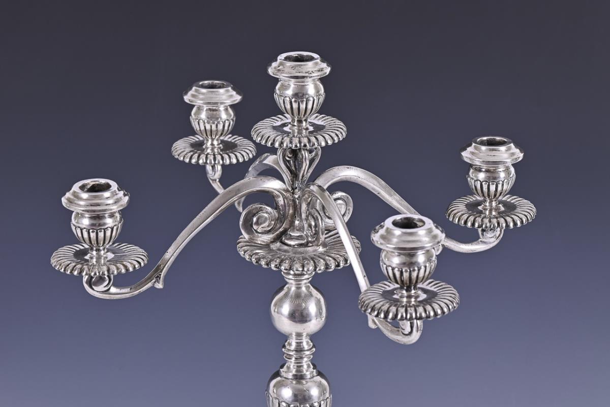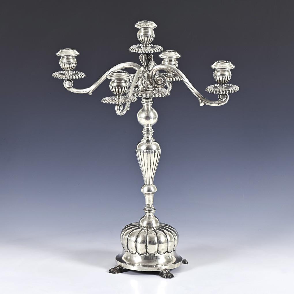 Heavy candelabra with baluster stem and lion paws. Signs of use, small dents, base of top spout with solder joint.