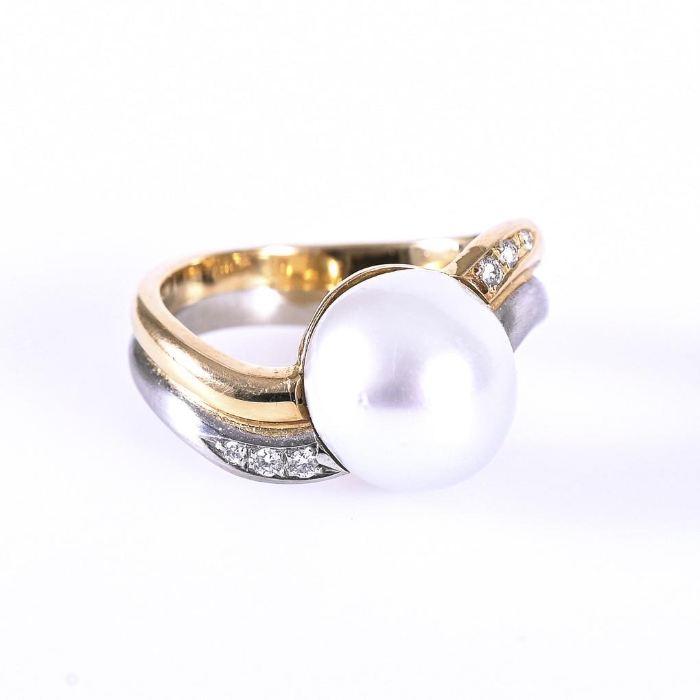 Yellow gold 750/Platinum 950 stamped. Ring size 48. cultured pearl Ø approx. 11 mm. 11,6 g.