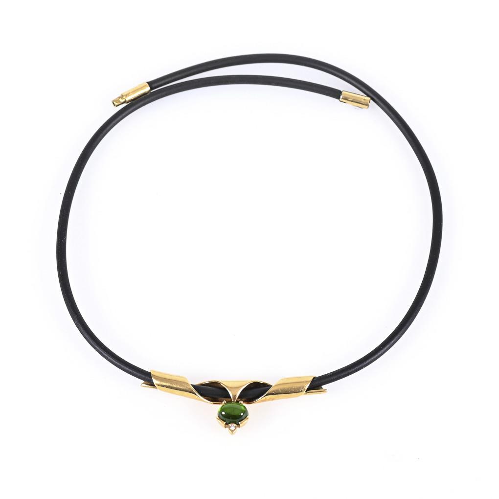 Show piece with tourmaline cabochon and small brilliant, on rubber strap with patent clasp.