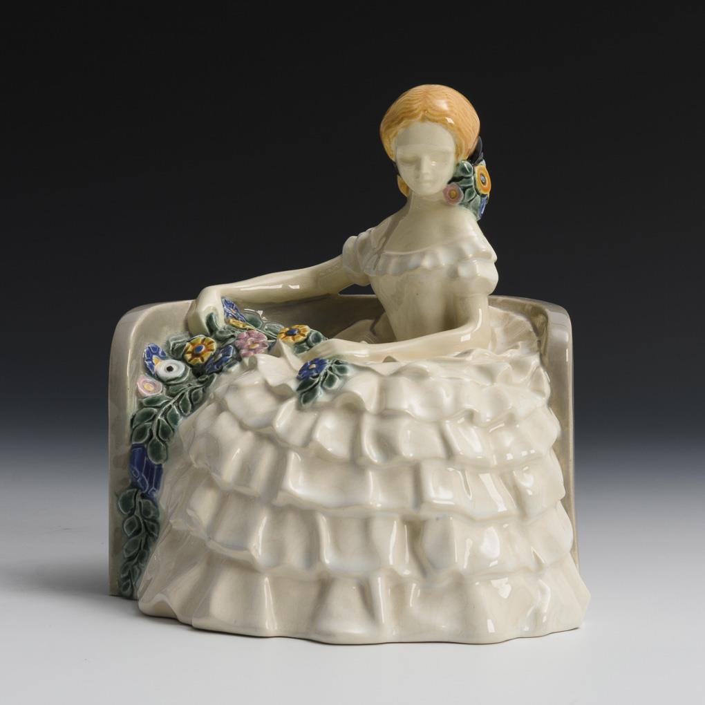 Art Nouveau figure: girl in crinoline dress on bench. Gmundner ceramics.