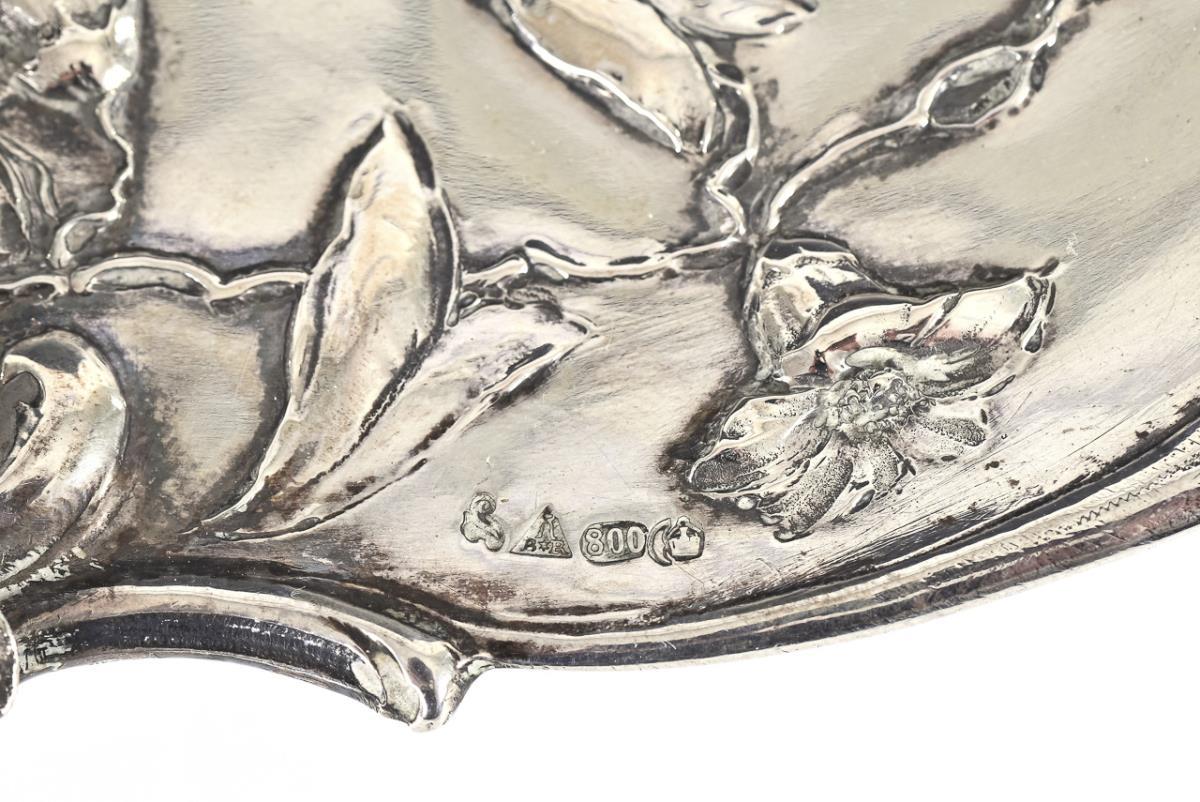 Floral relief bowl with vine handle and engraving: "1867 HB 1892". Signs of use, small dents in the mirror.