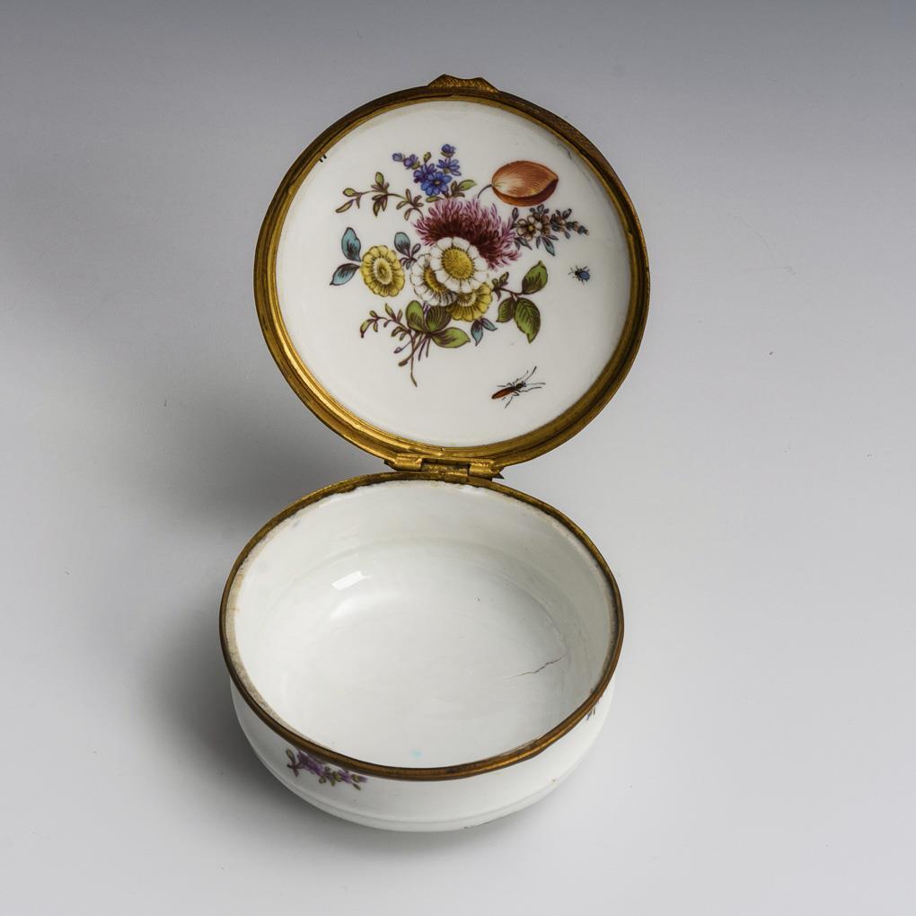 Round tabatiere with metal mounted hinged lid. All sides scattered floral and insect painting, on the lid a bisque medallion with the relief depiction of the Palatine-Bavarian Elector Karl Theodor of the Palatinate (1724-1799), after a medal created on the occasion of the founding of the Academy of Fine Arts in Mannheim, designed by the medalist and stamp cutter Georg Christoph Wächter (1729-1789). Bumps on the inner rim of the body, burn crack inside.