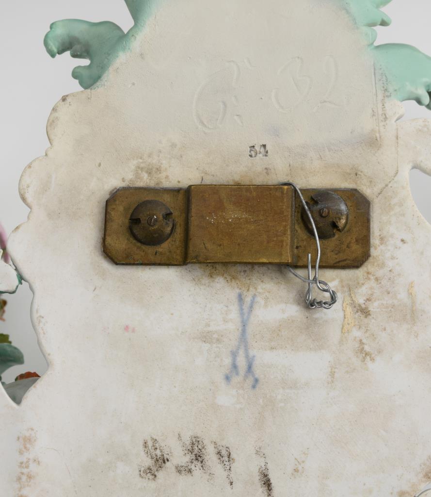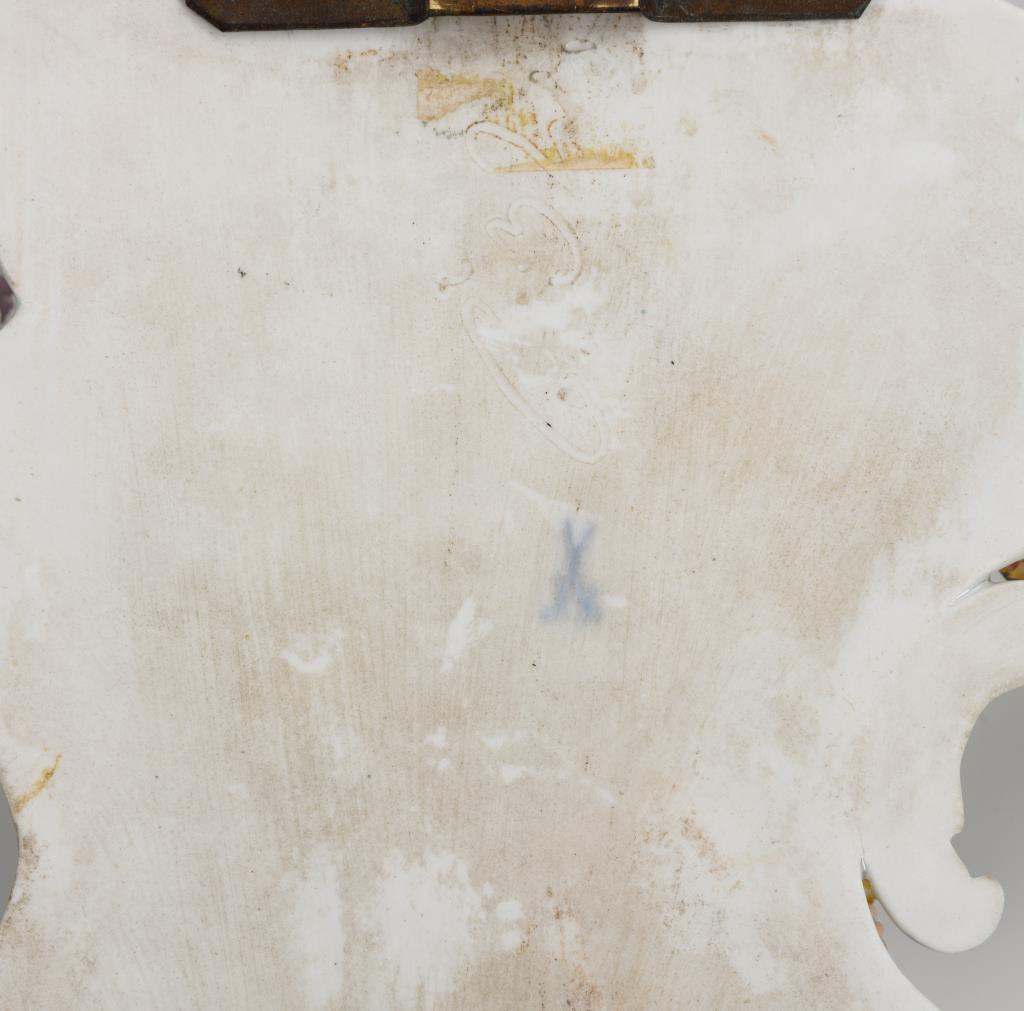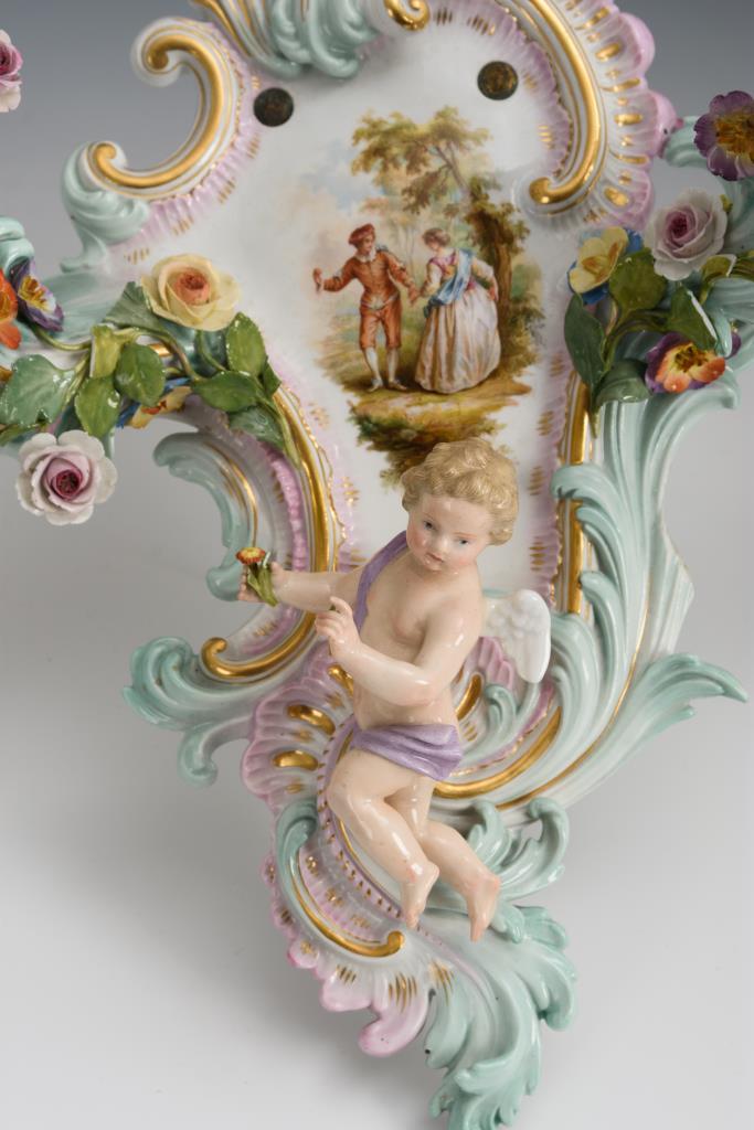 Rocailleschild mit zwei, reich mit Blüten belegten Leuchterarmen sowie einem schwebenden Amorknaben. Auf dem Rocailleschild je eine Watteauszene. Partiell Bestoßungen am Belag und Restaurierungen.