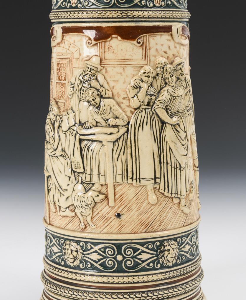 Conical form with historicist relief decoration and a cheerful inn scene. Fasson tin lid with shell pusher.