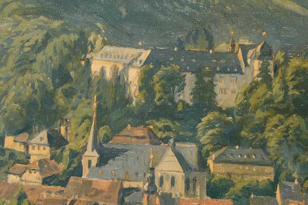 Blick auf die Stadt zwischen den Wäldern im hellen Sonnenschein. Restauriert.