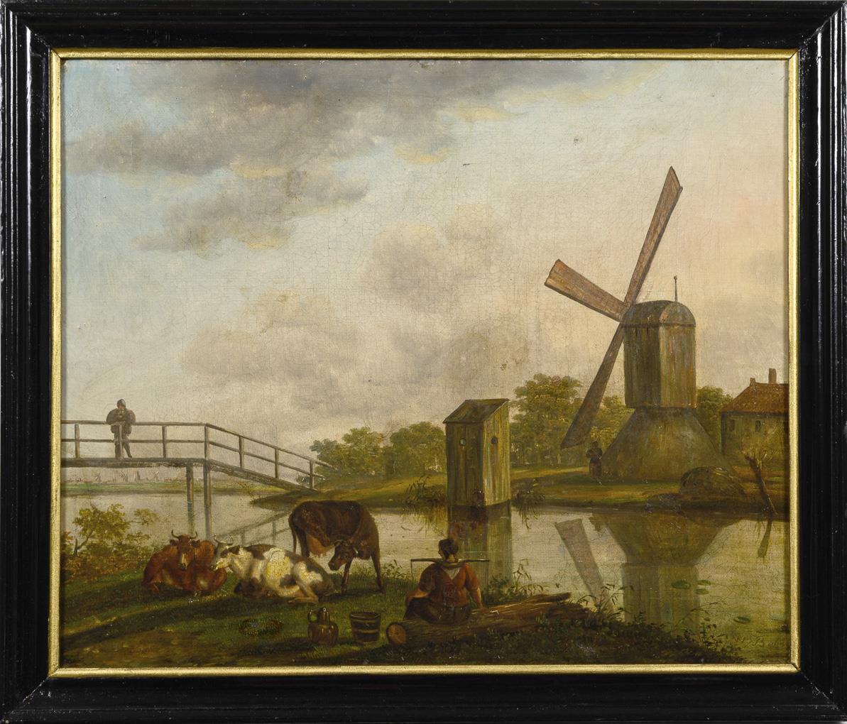 Village landscape with windmill as well as people with the cattle near the river bank. Restored with backstaining.