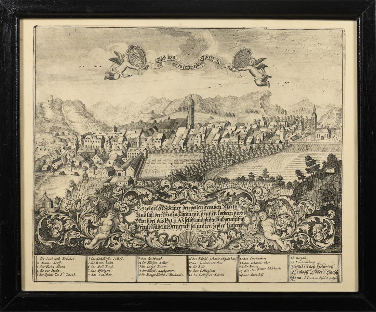 Historical general view of the city of Jena, with title cartouche "The itzo flourishing Jena" and legend, plus accompanying text "It shows JENA here the full joy courage And lets the Muses throne adorned with green laurels One hears that PALLAS himself also this Ausspruch thut Printz Wilhelm Heinerich sol unsern Zepter lead", below "Ita Compos:e. delineavit Ioh. Frid. Fischer. Ostheim. Franco Math. Studi". Somewhat foxing.