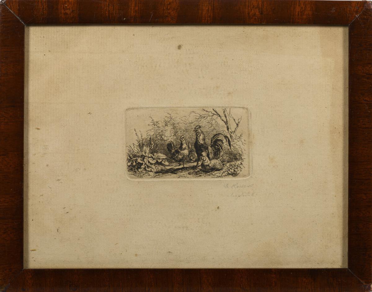 Plate: 4 x 7 cm. Framed & behind glass : 16.5 x 21 cm.