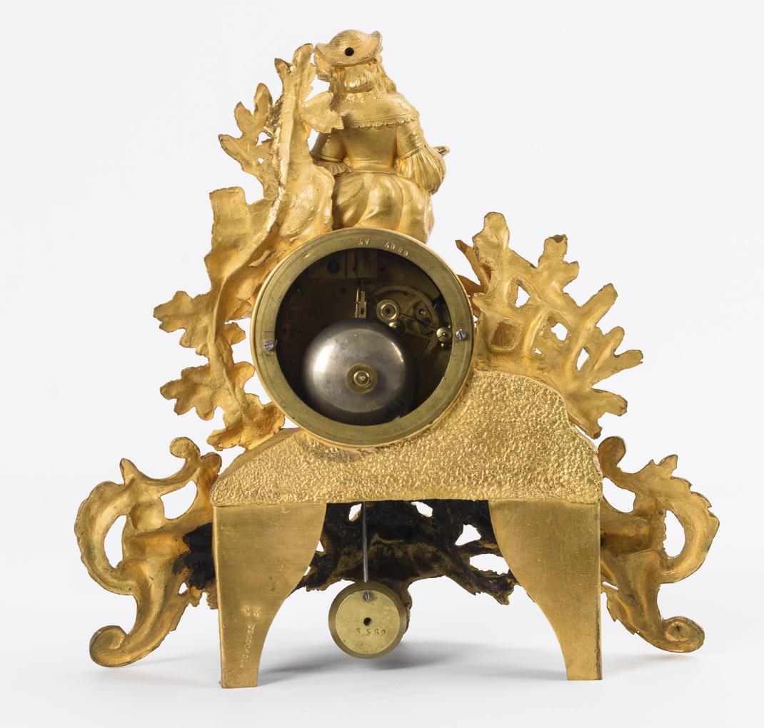 Metal casting gilded and rebronzed. Clock 29 x 28 x 12 cm, glass dome 42,5 x 36 x 18,5 cm.
