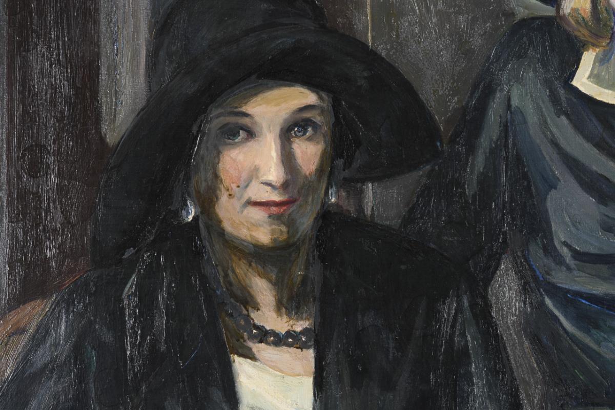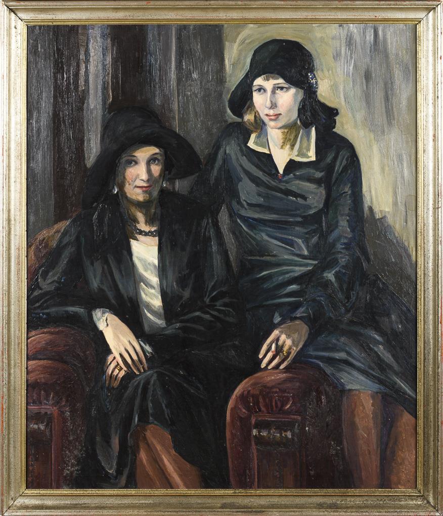 Large format portrait of two ladies in dark clothes with cigarette on an armchair. Slight signs of age.