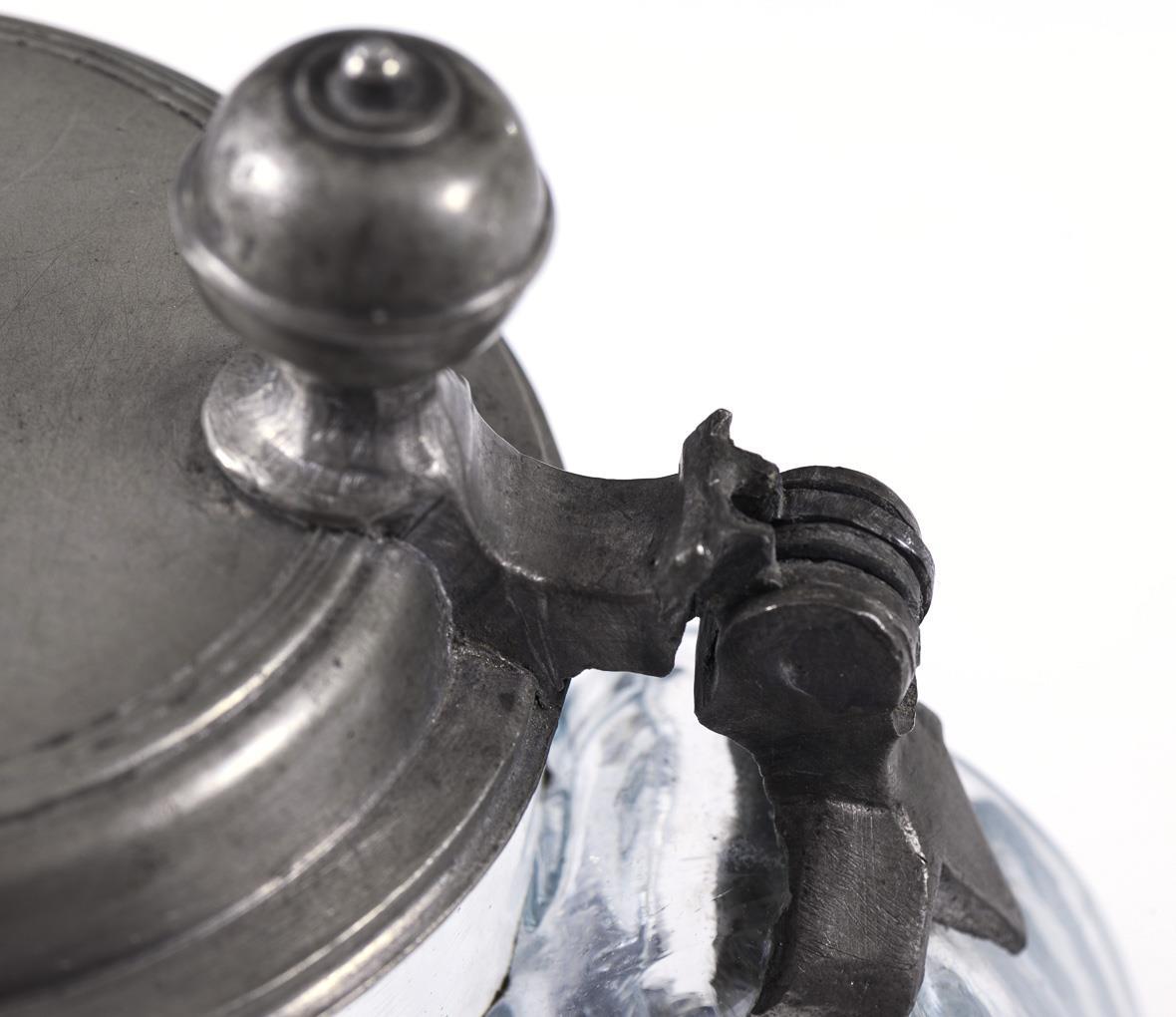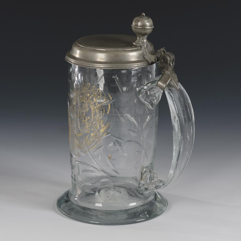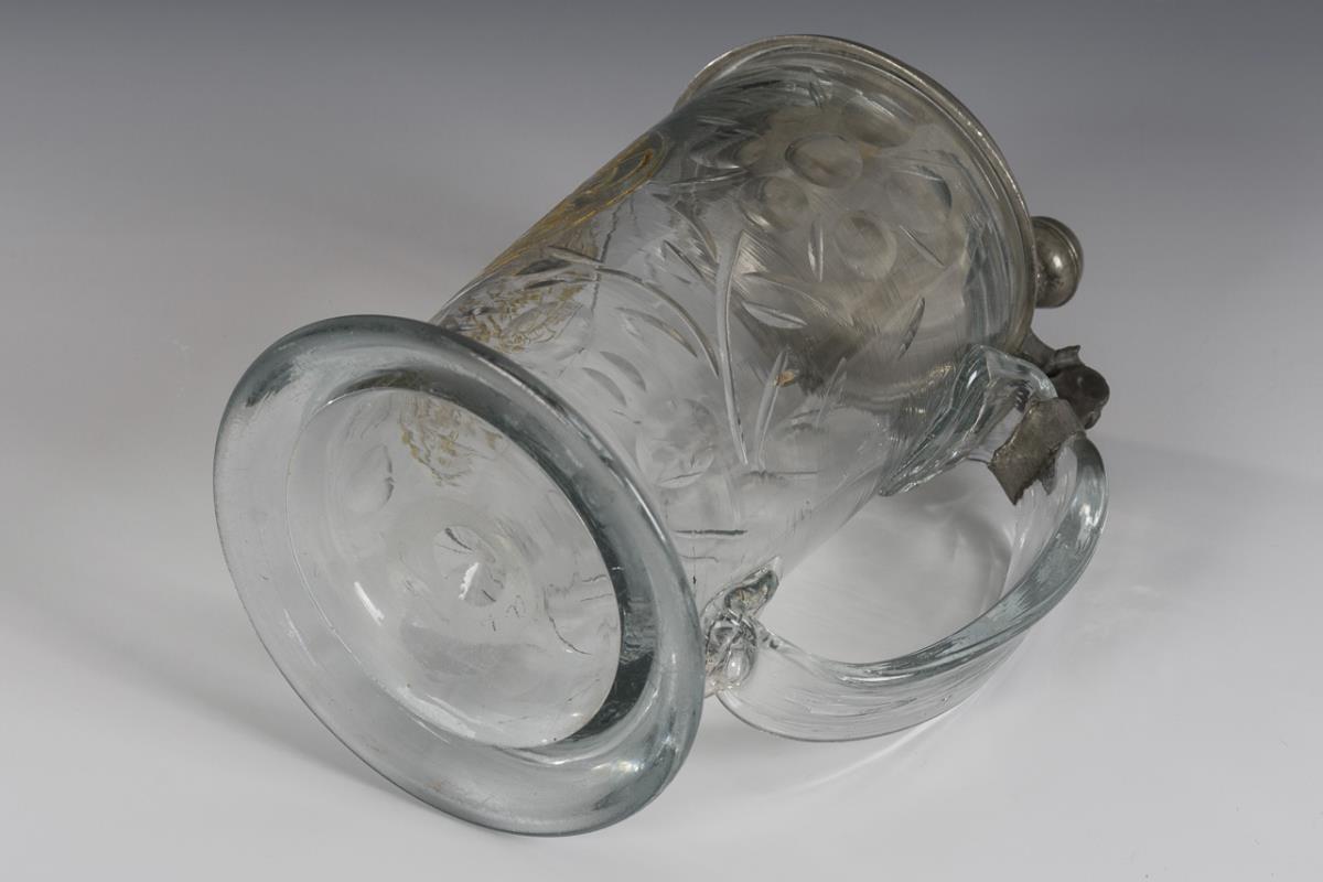 Roller jug with wide stand, ribbon handle and pewter mounted lid with ball pusher. On the front an engraved and gold-staffed medallion with the crowned monogram "FJH" surrounded by scythes, rakes, pitchforks and flails, verso notch and lenticular decoration. Bernished gold staffage.