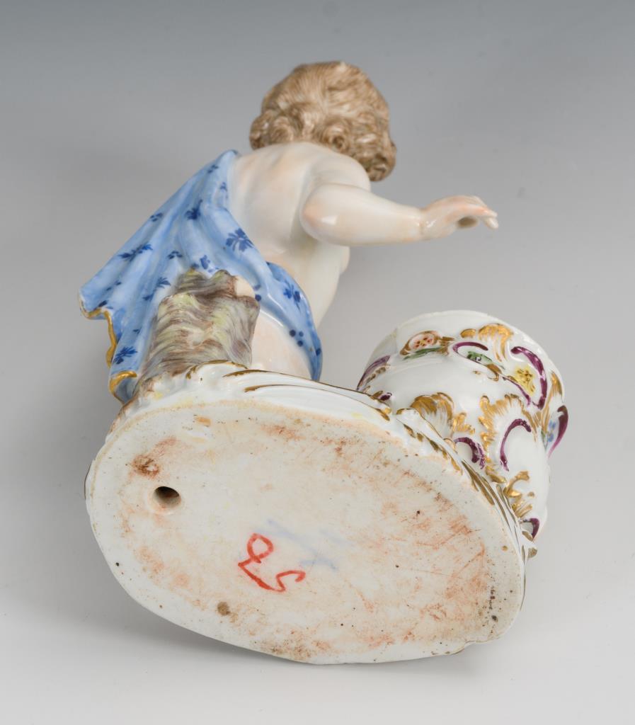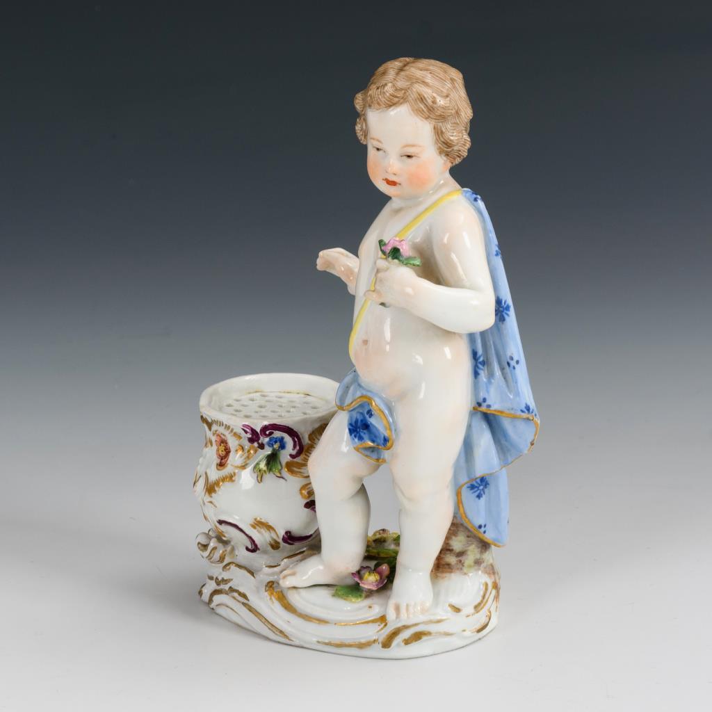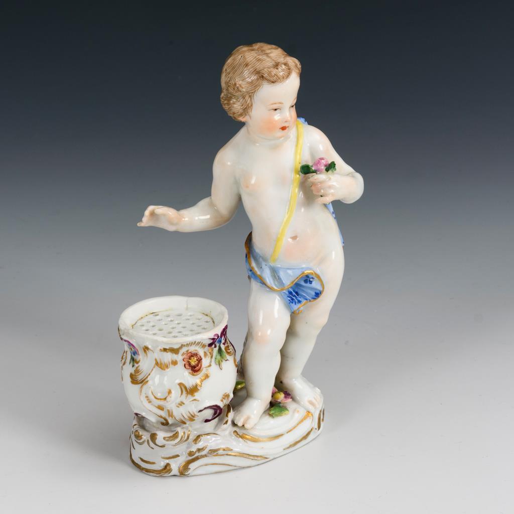 An einer Streudose stehender Putto mit Rose. Restaurierung am Sockelrand, rechte Hand und Rose restauriert.