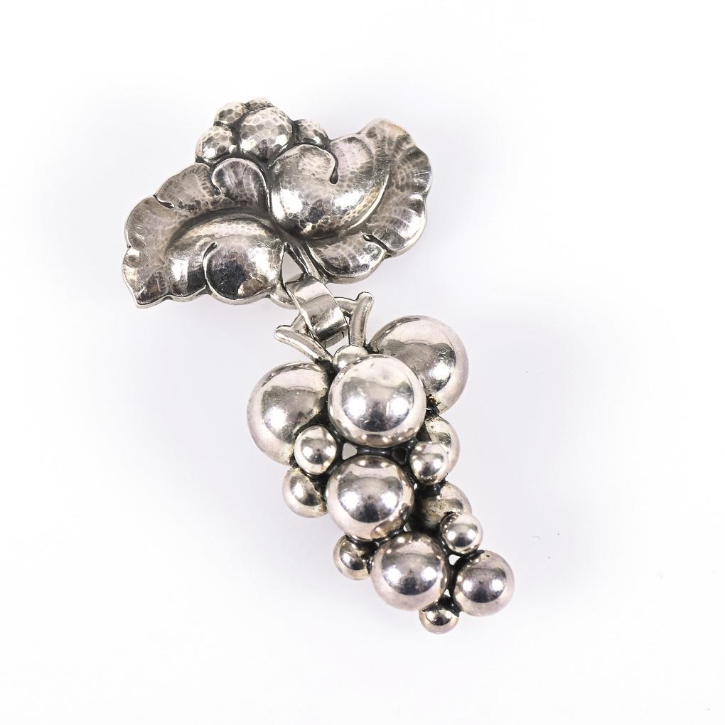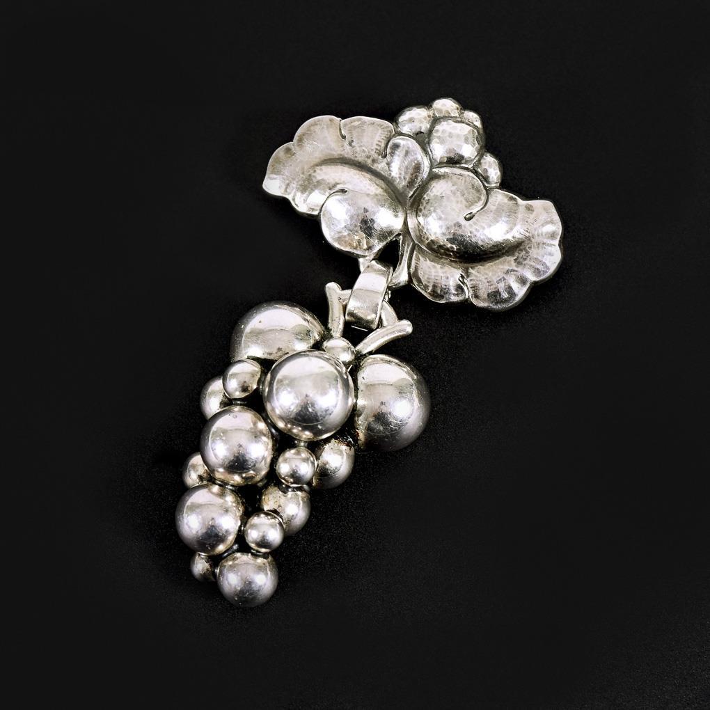 Sculptured grape suspended from leaf brooch in relief. Ball hook.