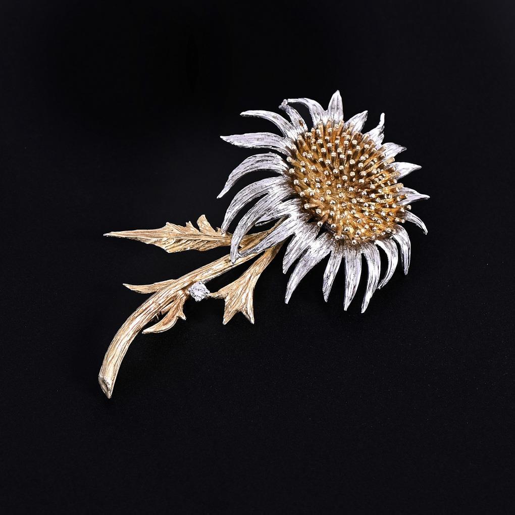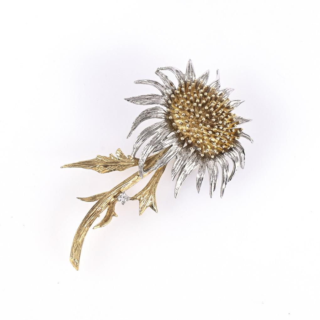 Sculptured brooch with small chaton set diamond. Sliding hook.
