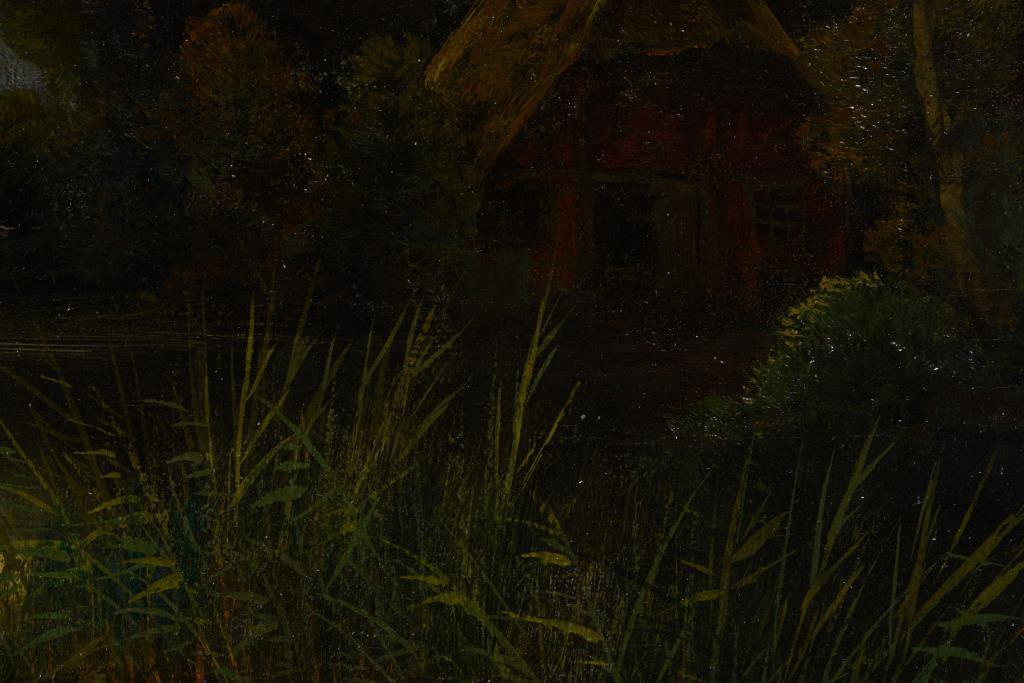 Kleine Kate zwischen Bäumen am Ufer des Flusses. Leichte Altersspuren.