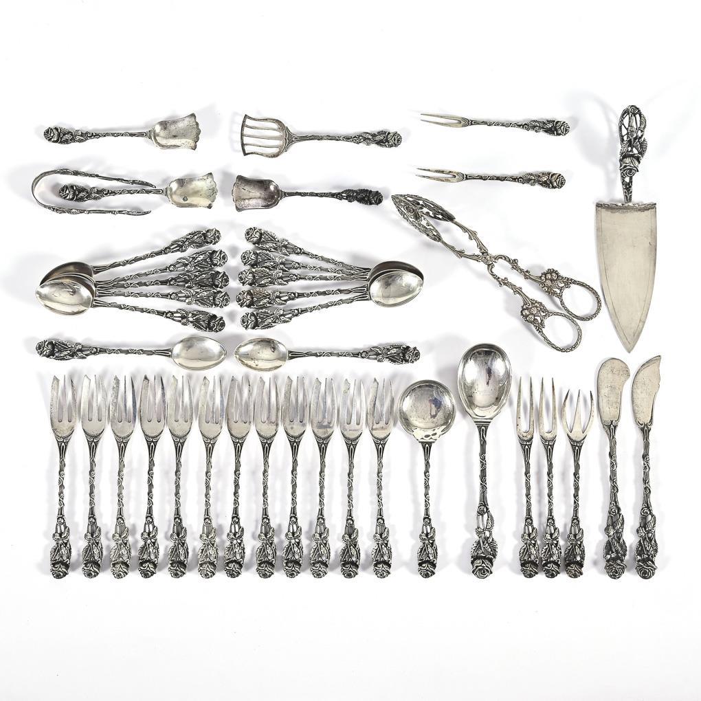 40 pieces with decoration Hildesheim Rose: 12 cake forks, 12 coffee spoons, cake server, pastry tongs, sugar tongs, 3 sugar spoons and 10 serving pieces.