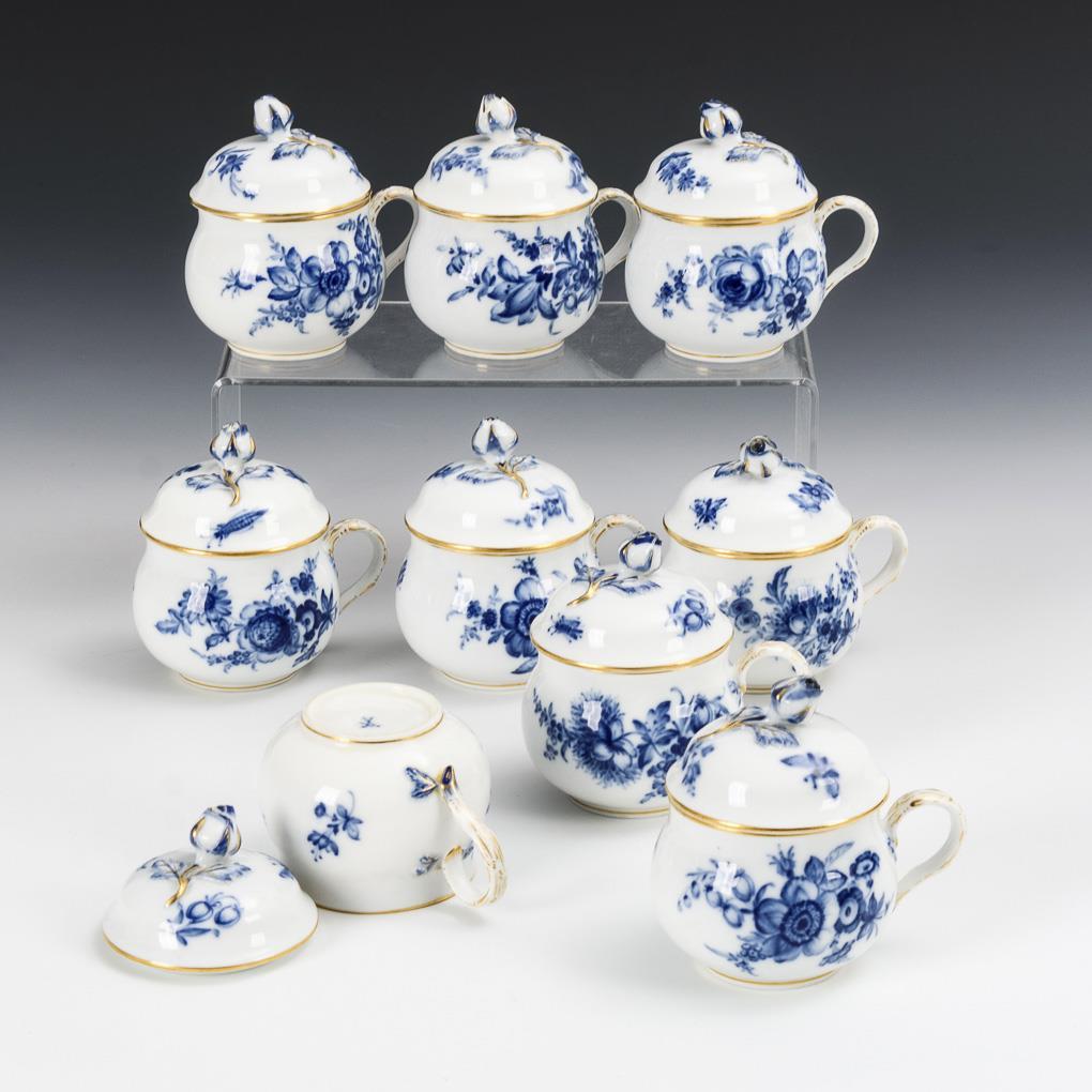 Cups with branch handles and rose knob lids. With underglaze blue floral and insect painting and gold staffage. Rose knobs bumped.
