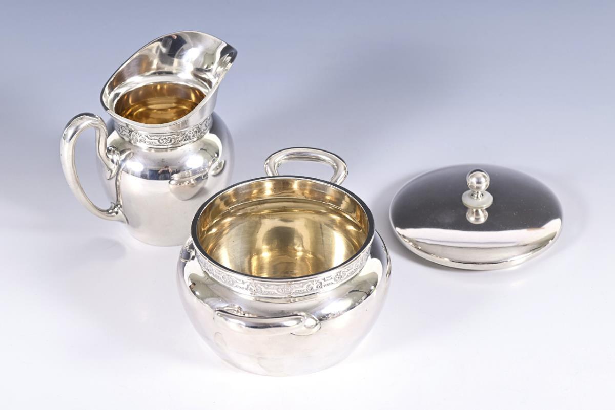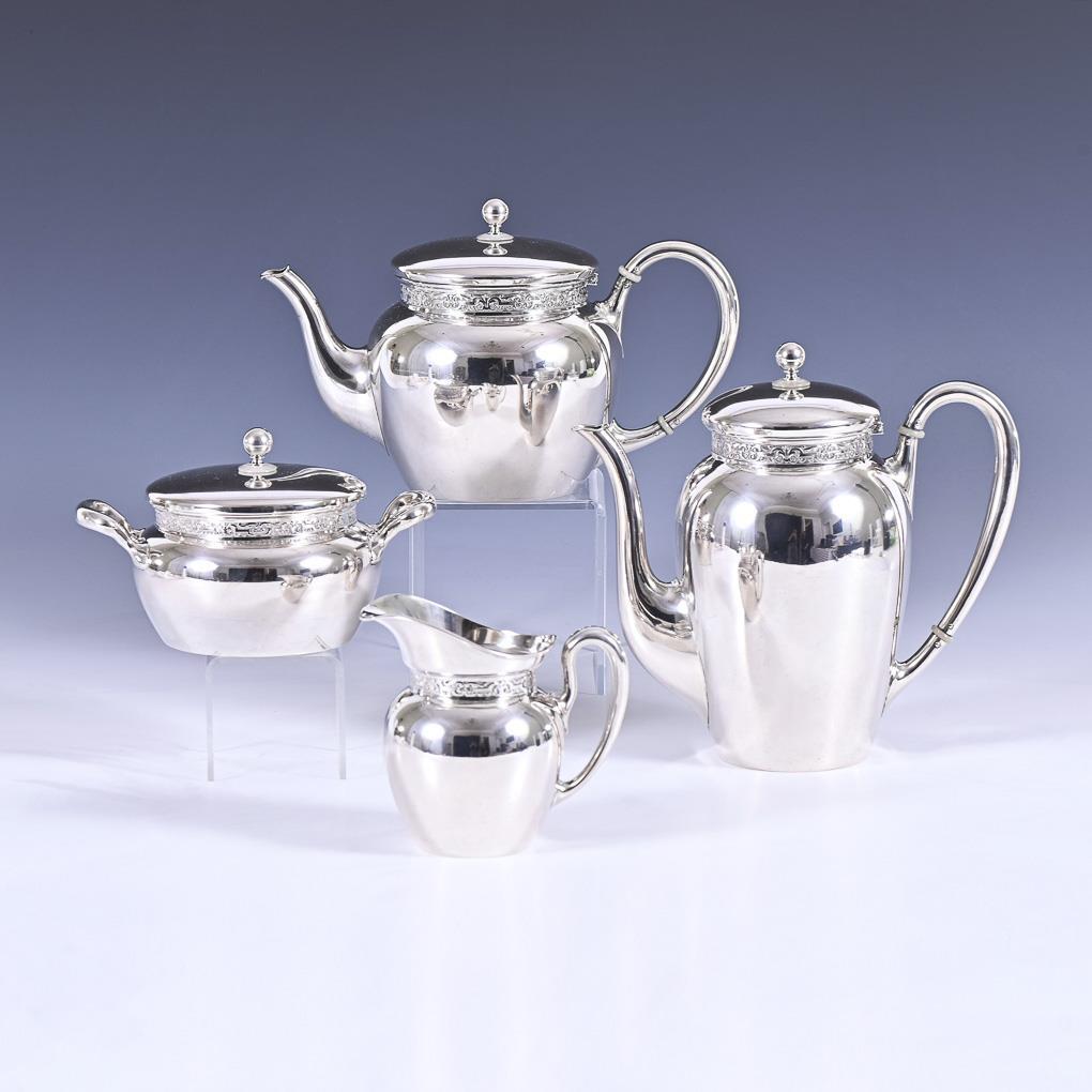Timeless form with narrow relief band: coffee pot (h 19,5 cm), tea pot (h 15 cm), cream pourer and sugar bowl. Pots with few small dents.