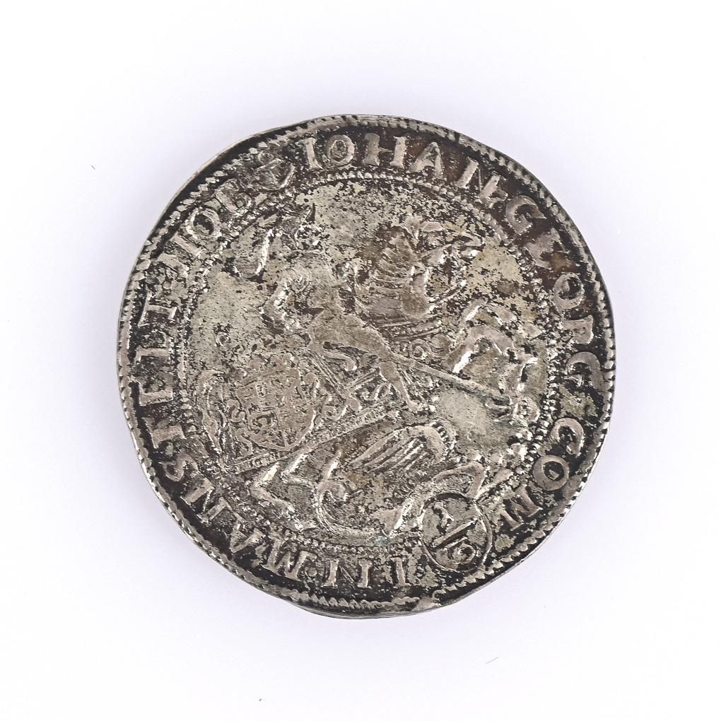 "Mansfelt Nob. Iohan George Com III", St. George with dragon, riding to the right. (John George III 1663-1710). Condition: very nice to excellent, beautiful patina.