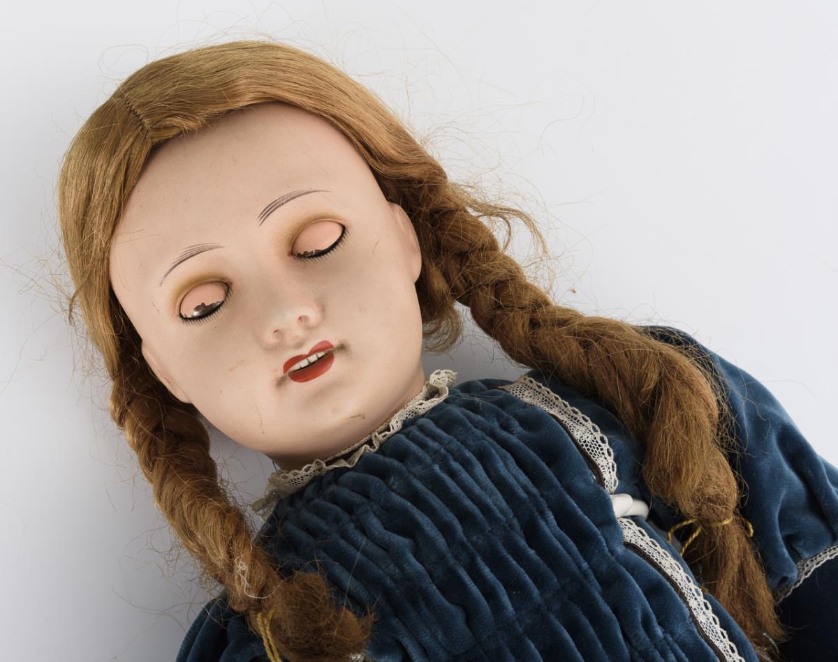 Sprayed crank head, blue sleep eyes, medium blond synthetic hair wig. 11-piece articulated body. Blue velvet dress, black patent shoes. Hairline crack at the back of the head, head crown with minimal bumps. Body with color defects, middle finger left missing.