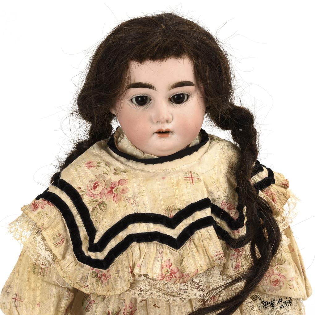 Brown sleeping eyes without eyelids, dark brown human hair wig with braids. White leather body with knee gussets and younger limbs made of fabric. Light dress with floral pattern and black velvet trim, younger wine red leather shoes. Head not x-rayed: without visible defects. Body with supplemented limbs, fingers of the left hand minimally bumped.