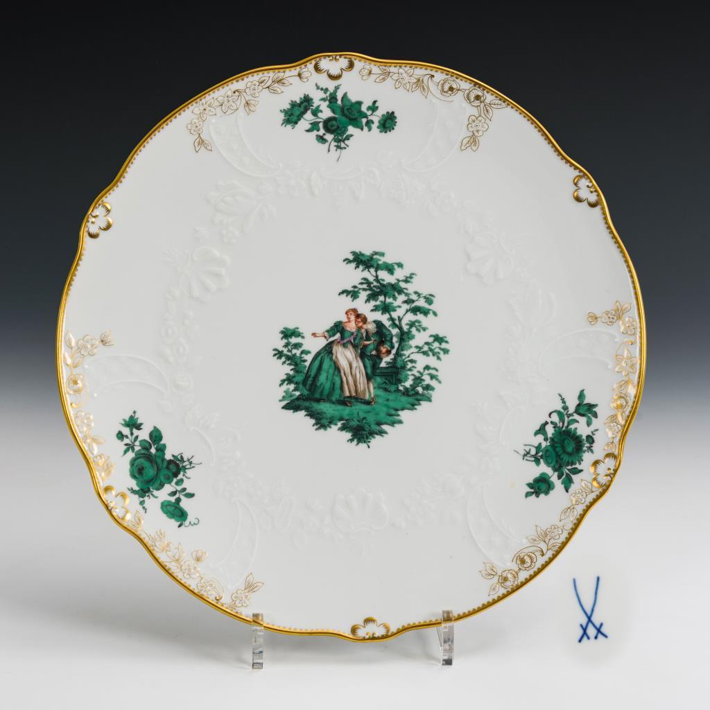 Kupfergrüne, teils farbige Watteaumalerei und Blumenmalerei, goldstaffiert.ø 32,5 cm.