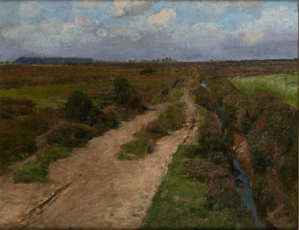 Kanal und Feldweg zwischen Wiesen und Feldern in weiter, flacher Landschaft.