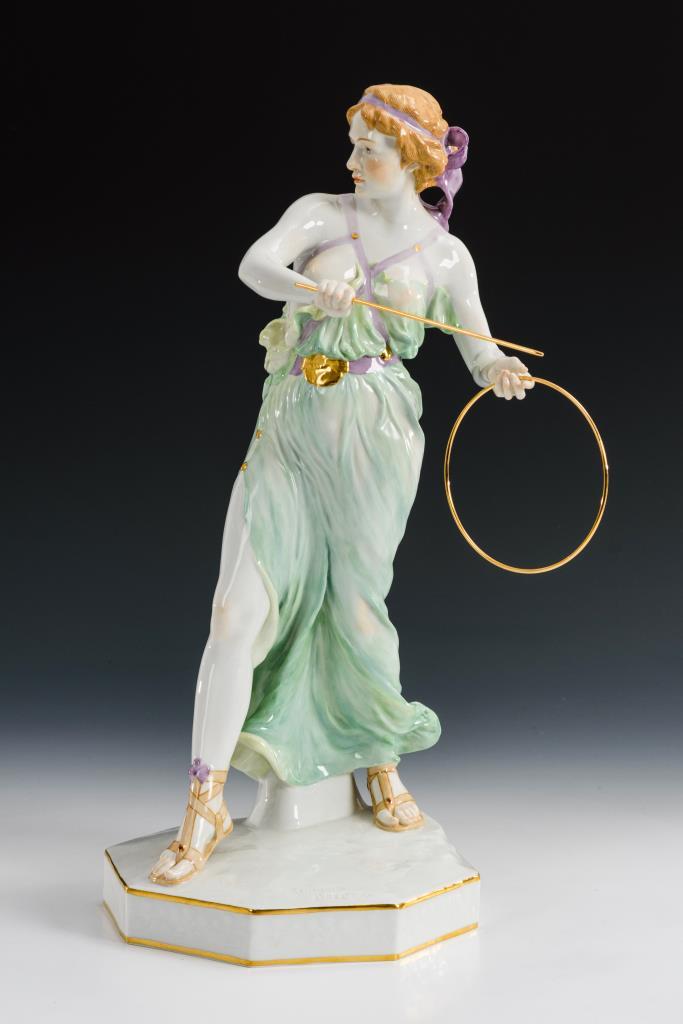 Antikisierend gekleidete junge Frau mit Reifen und Stab.