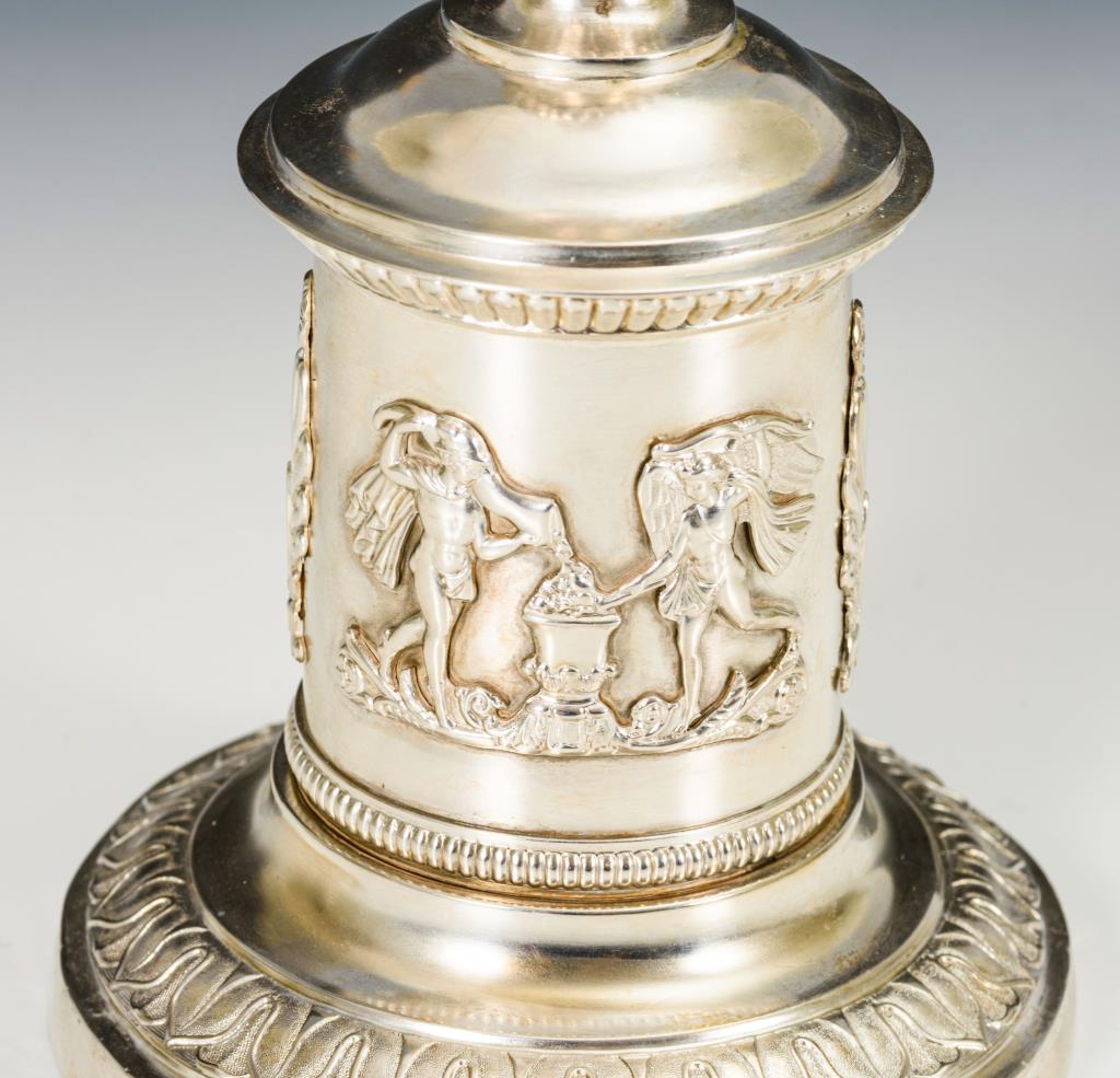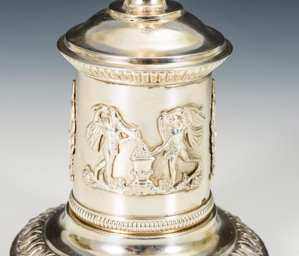 Säulenförmiger Schaft auf hohem Sockelzylinder mit applizierten Antikenmotiven. Fuß leicht gelockert.