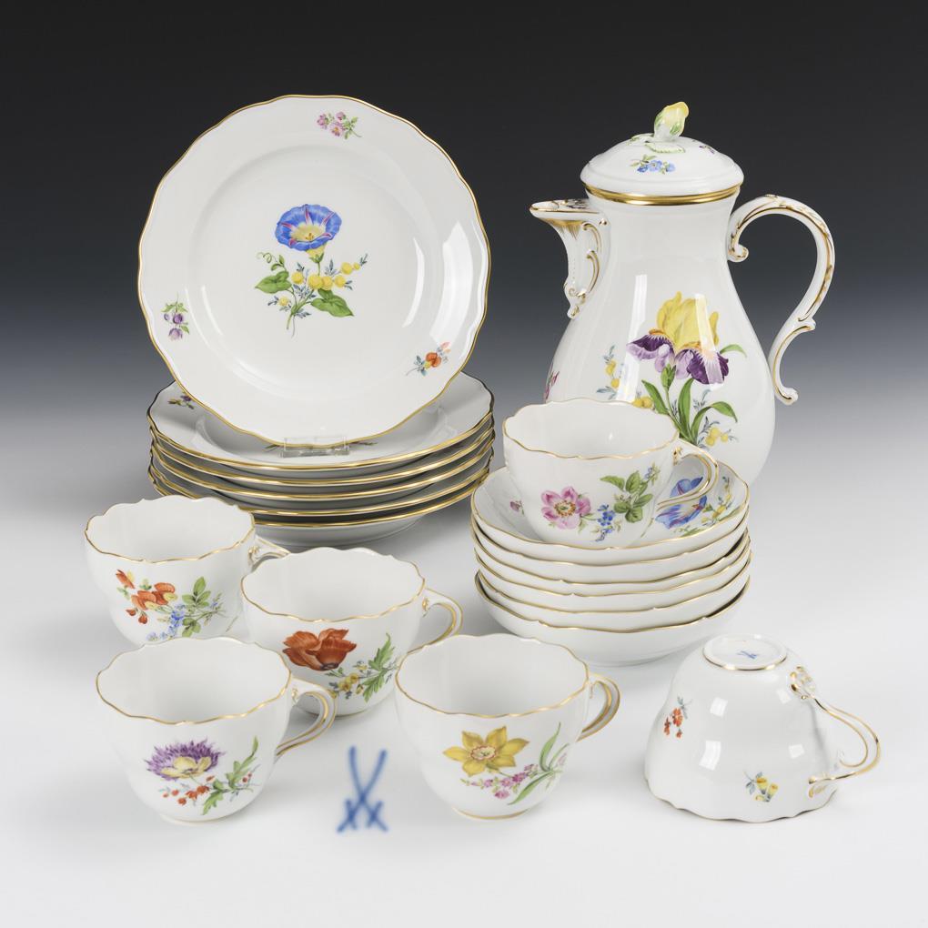 Form "New Cutout". Coffee pot (h 24 cm), 6 cups, 6 saucers and 6 breakfast plates.