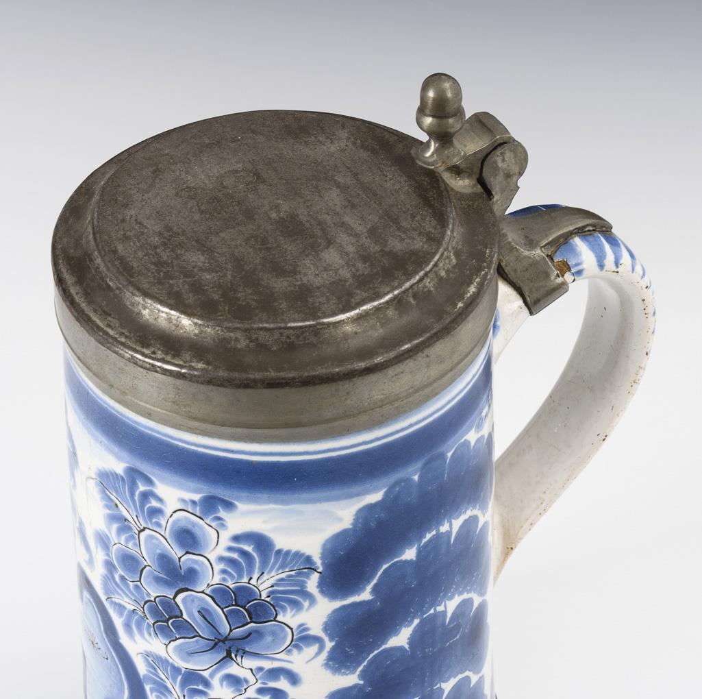 Cylindrical jug with line-decorated ribbon handle. On the front a rock depiction between large flowers and tier trees. Completed pewter lid with acorn pusher, engraved "GD", pewter stand ring. Fine wall crack, partial light glaze rubbing and bumping, defects on the pewter.