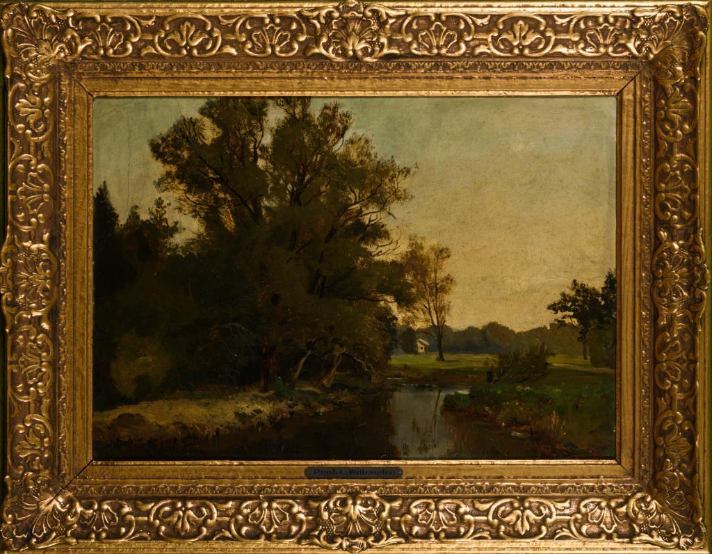Das seichte Gewässer am Waldrand nahe einem Haus auf der Wiese. Leichte Altersspuren.