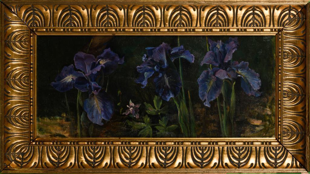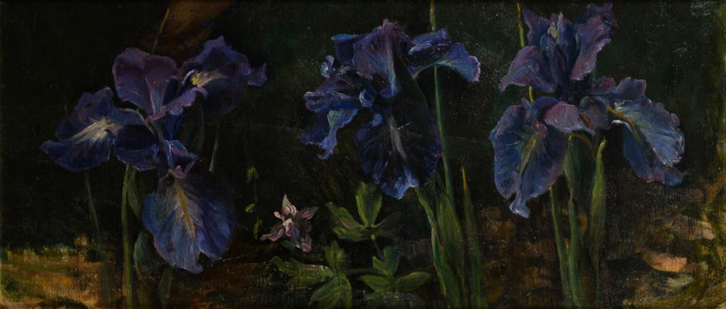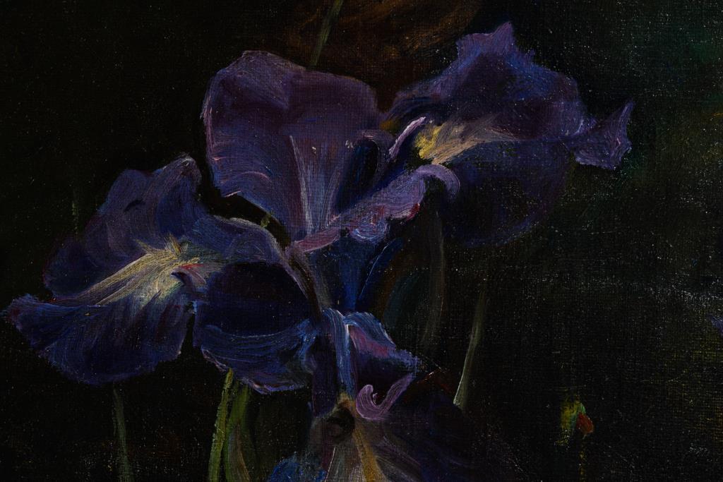 Nahezu porträthaft gemalte drei Blumen in leuchtenden Farben. Leinwand doubliert.
