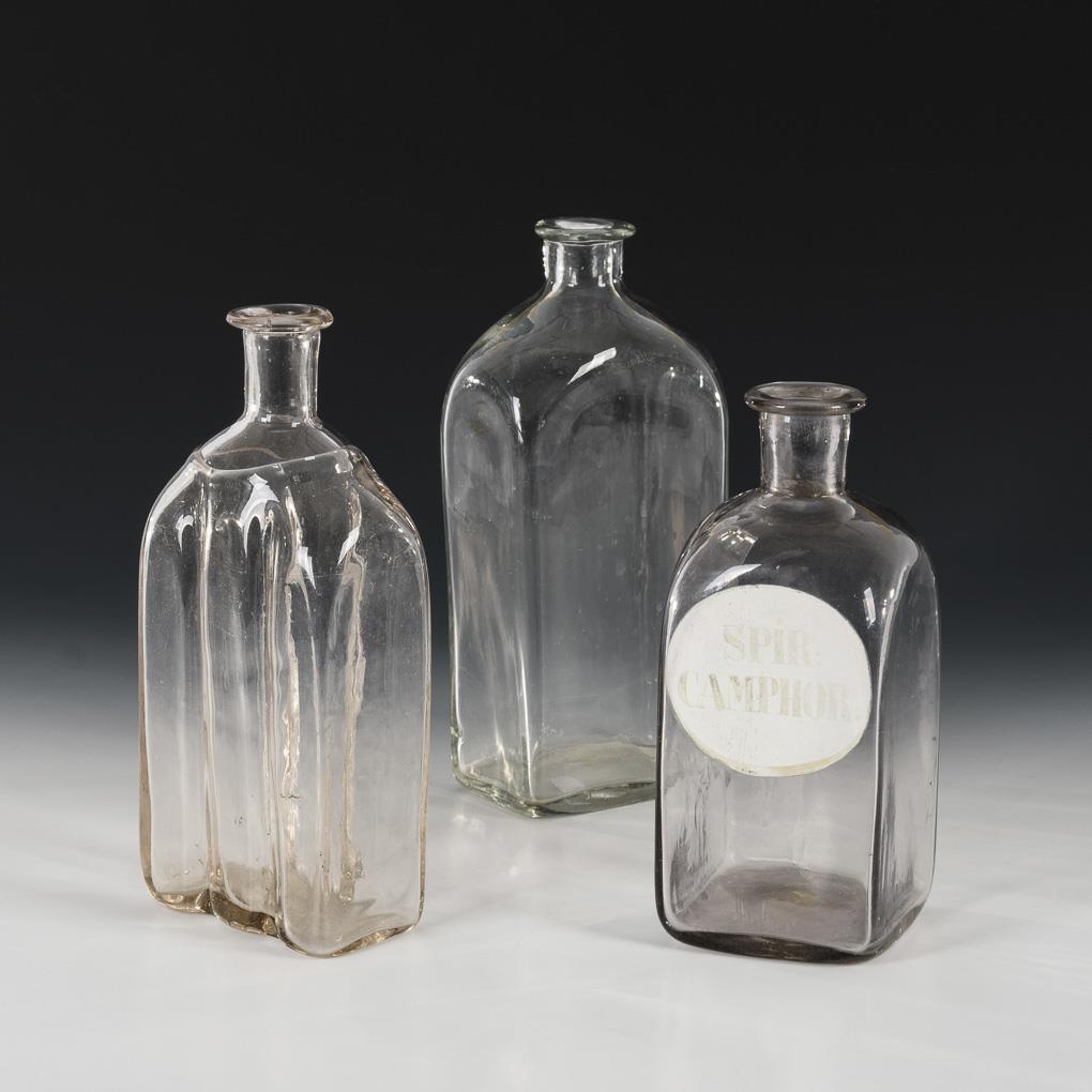 1 clamshell bottle, 1 square bottle and 1 apothecary bottle with rubbed inscription "Spir. Camphor." All with tear.